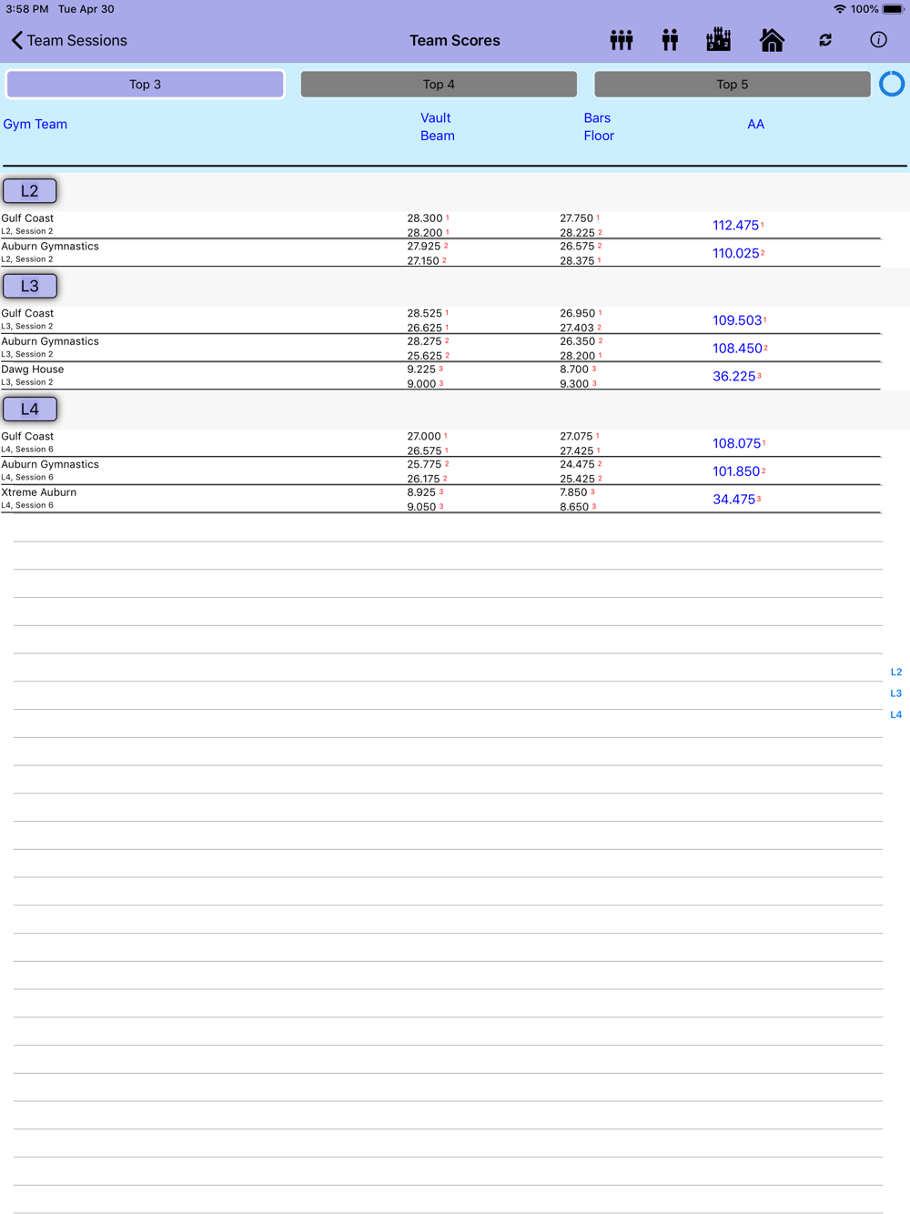 I can see my daughter's whole team at one time or I can view her specific scores, average scores for the year, and the top three scores she needs to beat. There is a new Team Score view and a history of previous meets.