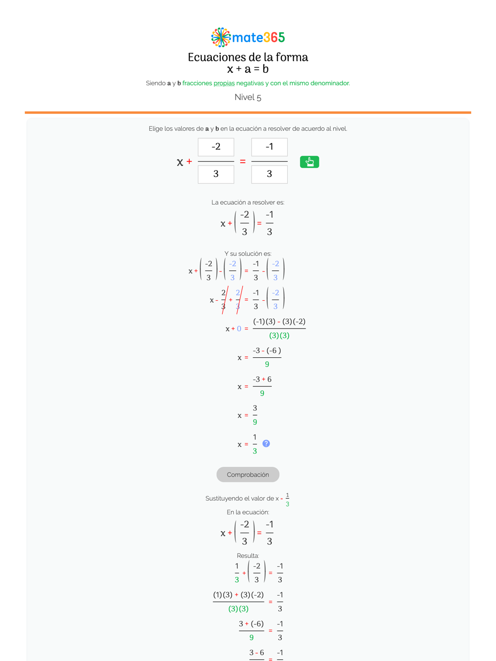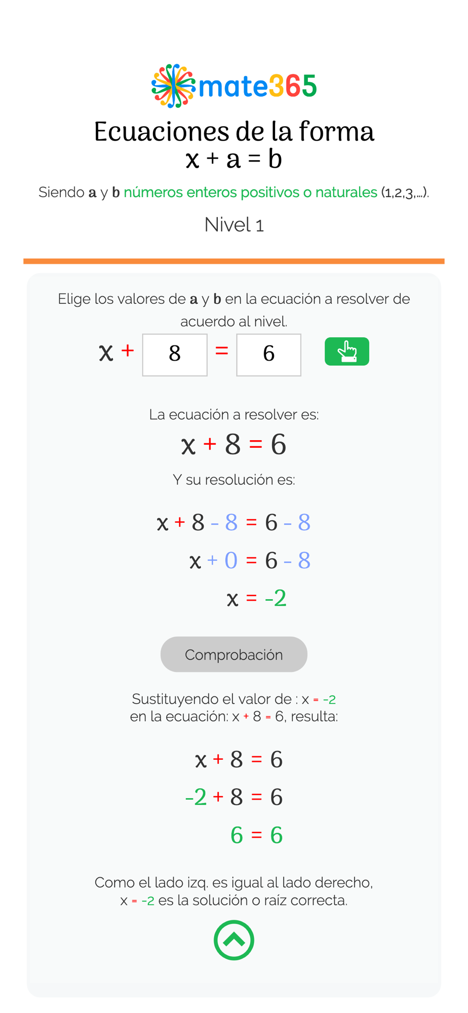 Mate365, presenta la resolución de miles de casos diferentes de ecuaciones lineales o de primer grado de la forma: x+a=b, al considerar diferentes valores numéricos para las literales: a & b en los conjuntos de los números NATURALES ( N ), los ENTEROS ( Z ), y Racionales ( Q ) o FRACCIONES comunes PROPIAS E IMPROPIAS con signos positivos y/o negativos . Este tipo de ecuación es de las más básicas, pero es muy importante su aprendizaje durante la resolución de ecuaciones lineales más complejas y que se presentan en las app´s 3,4,5, y 6 de nuestra colección.