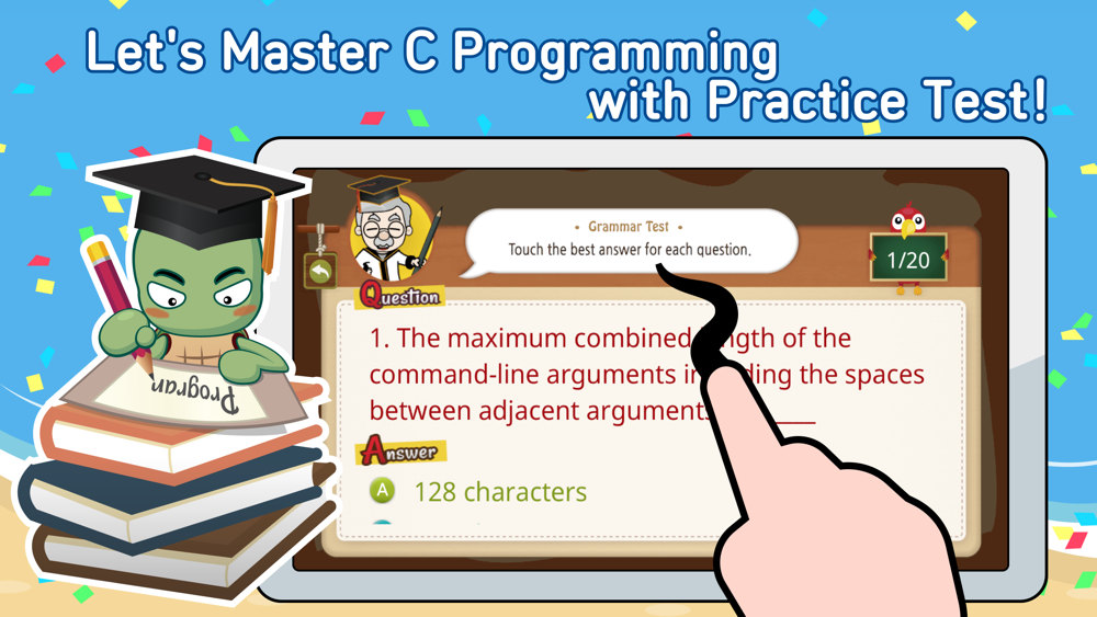 4) Test - 대학교 커리큘럼에 맞춰 제작된 다양한(Computer/C Library/C Grammar/C Source) 테스트 문제를 풀며 C 프로그래밍을 학습할 수 있습니다.