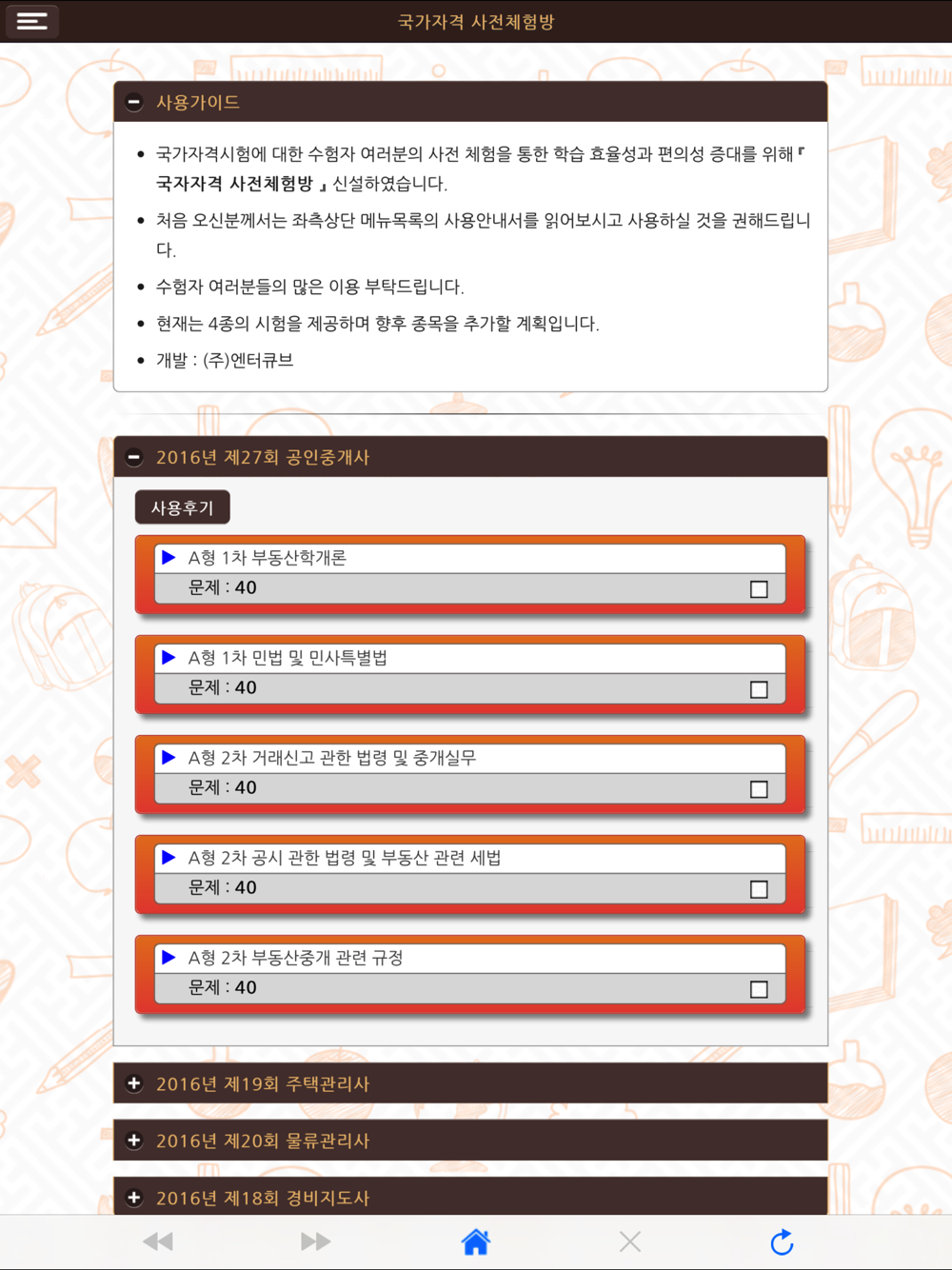 - 『 2017 전문자격시험 자격체험방 』 은 아이폰 또는 아이패드를 이용하여 언제, 어디서든 손쉽게 시험문제를 풀이해볼 수 있는 응시자를 위한 앱입니다.
