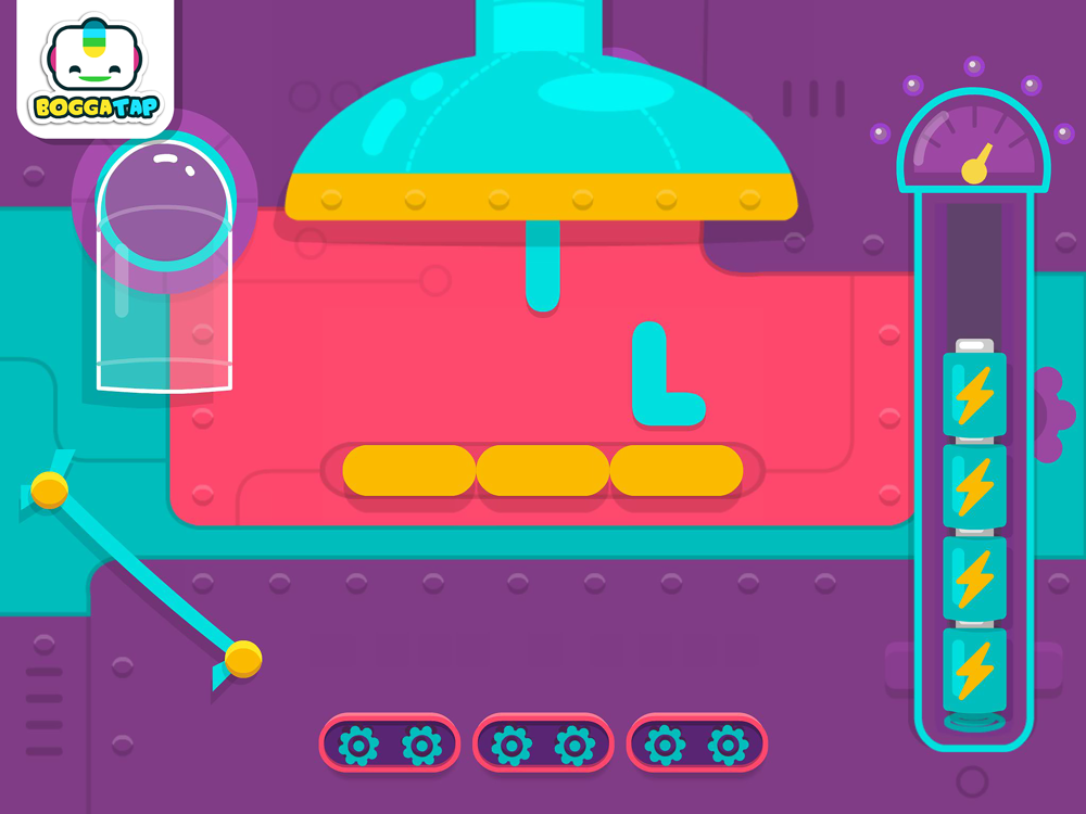 Bokstaver popper ut av en magisk maskin. Lytt til ordet som skal staves, og dra så bokstavene oppå hyller i riktig rekkefølge. Stabler du flere ord, venter det en glitrende skatt i belønning!