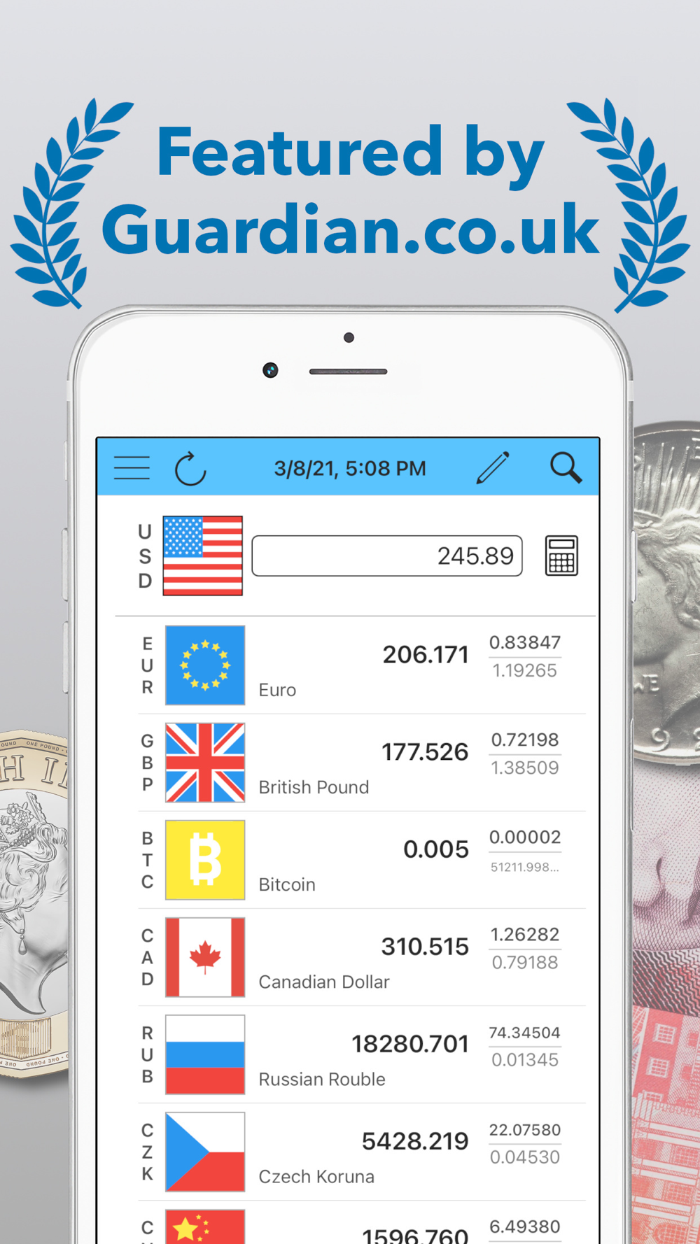 Splitting the bill? Investing in forex? Use the currency calculator button on the main screen.