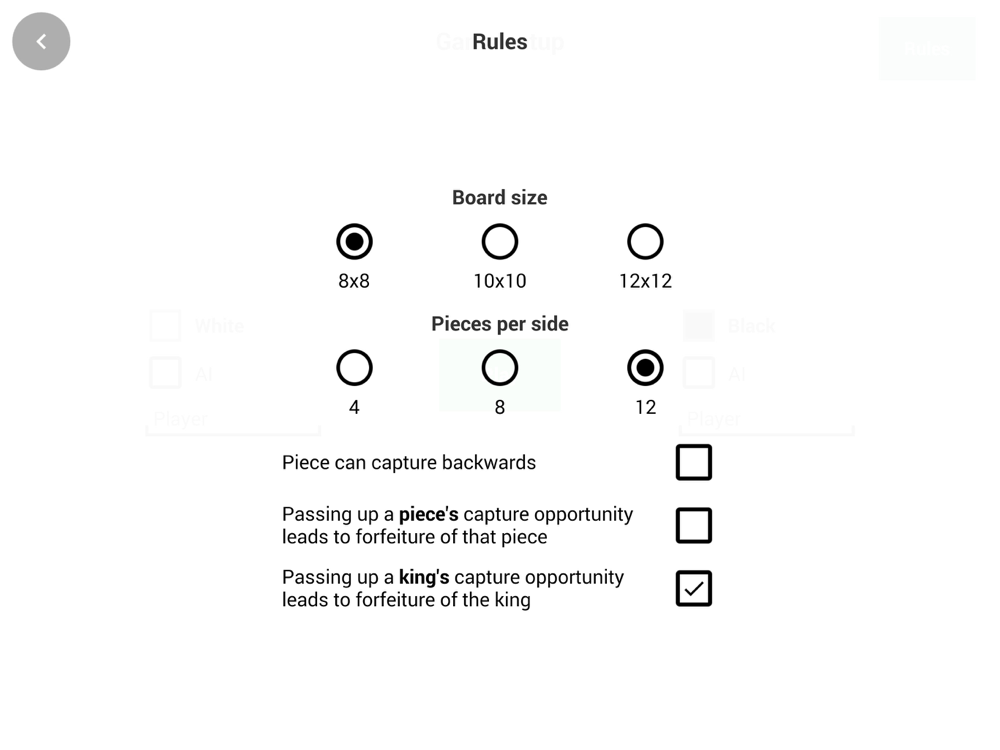 You can choose the size of the board, either 8x8, 10x10 or 12x12. Depending on your preferences, you can also choose the number of pieces on the board and other rules which can be found in the game rules section.