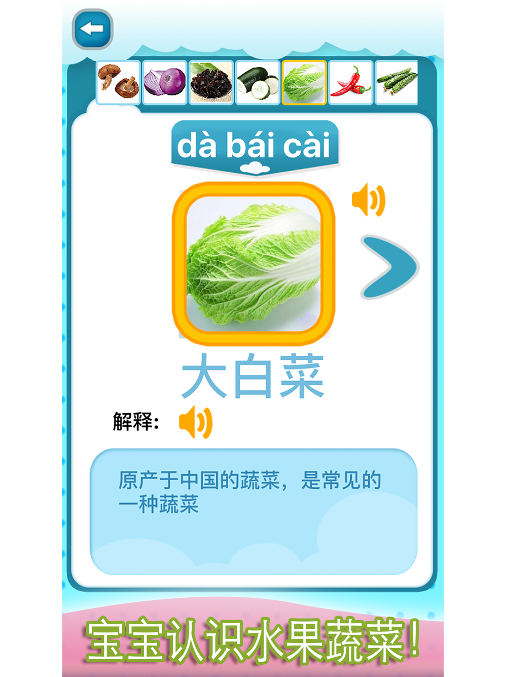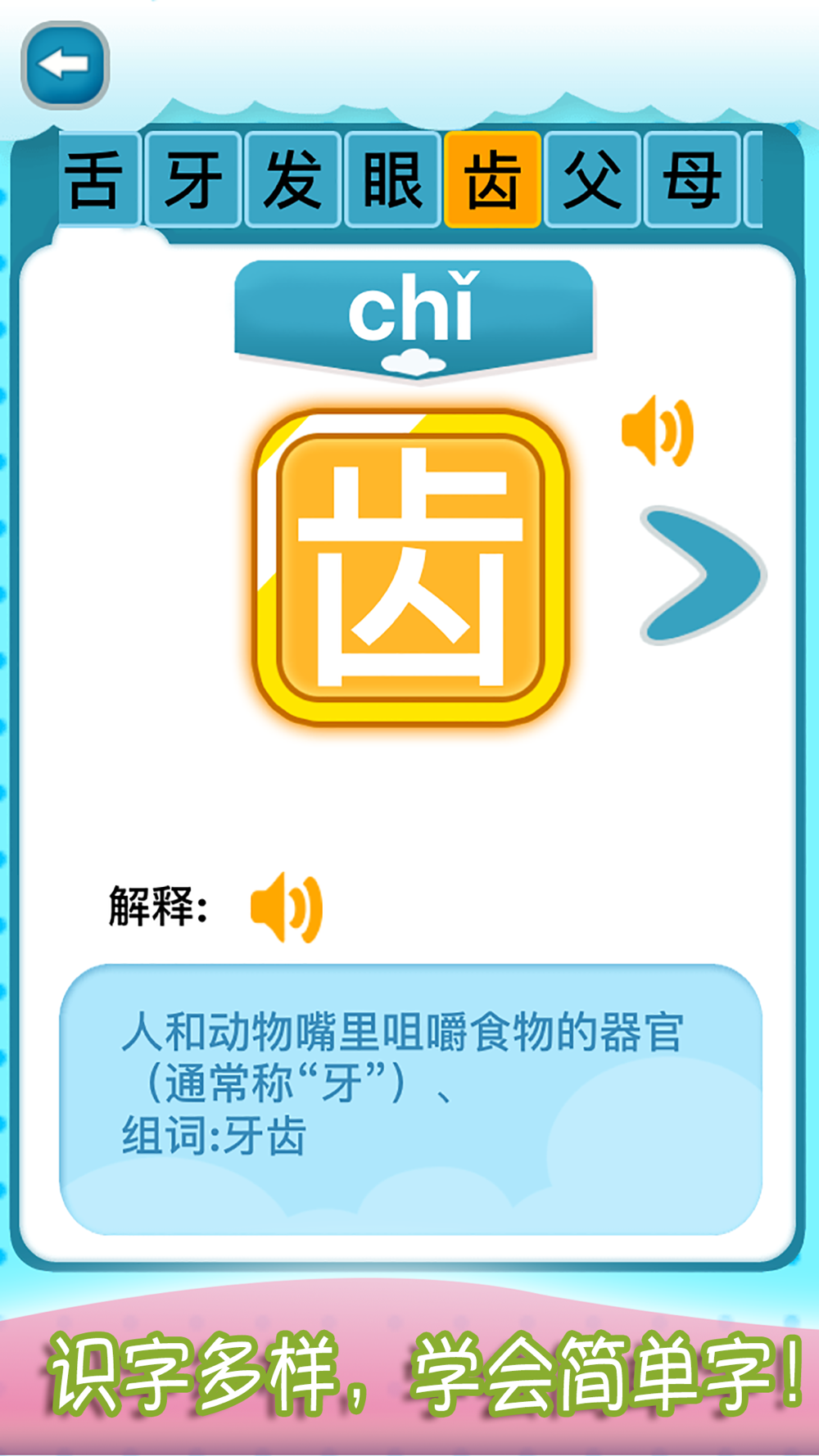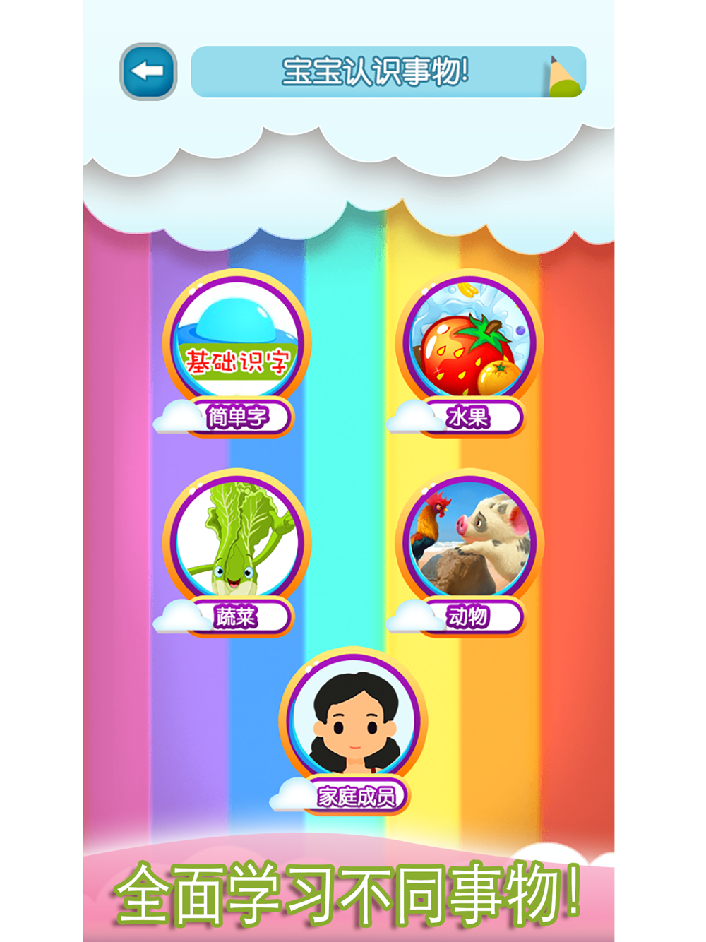 这是一款很不错对识字应用,很适合小孩子识字、认知等启蒙教育。它的功能很多:可以学习简单字、认识水果蔬菜、认识动物和家庭成员,非常适合儿童宝宝早期教育!
