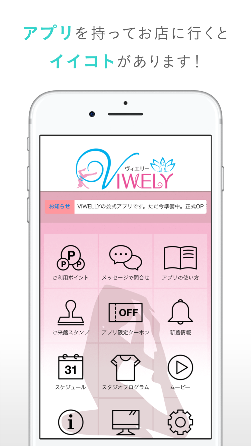 茨城県つくば市にあるコラーゲンホットヨガと空中ヨガで有名なヨガスタジオ【VIWELY(ヴィエリー)】の公式店舗アプリです。