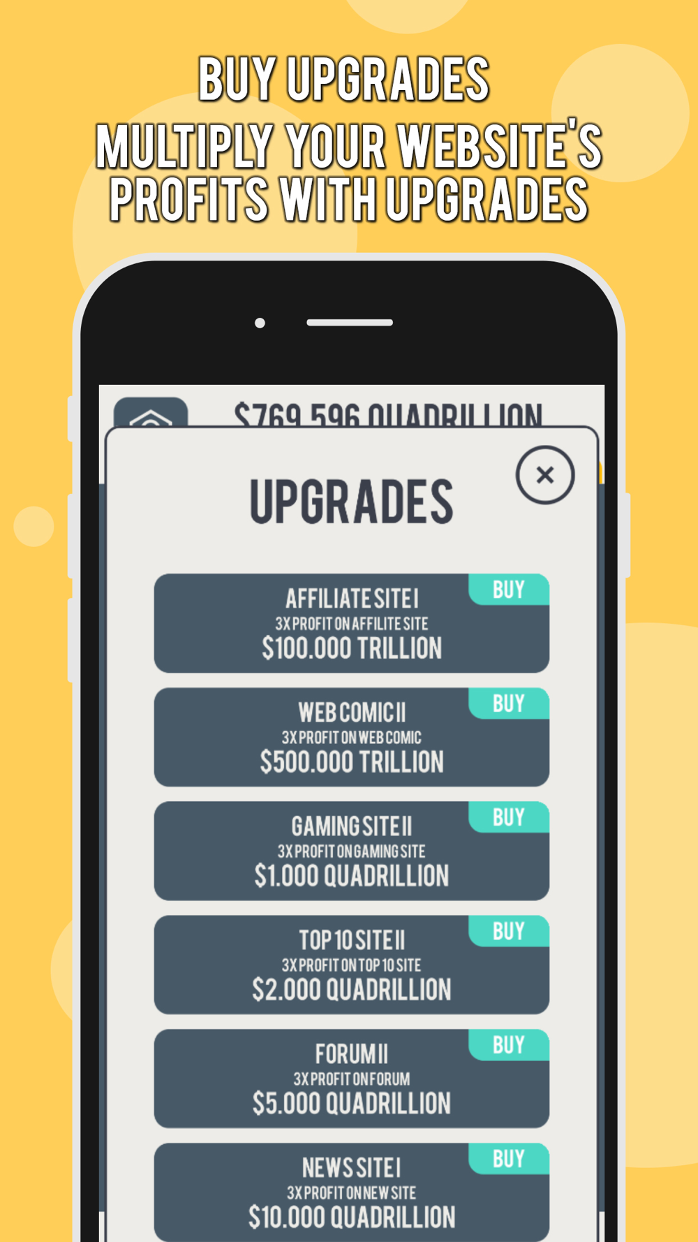 Start off with enough money to buy your first domain for your Personal Website and build a huge portfolio of 25 websites! Upgrade them, get profit and speed multipliers, hire managers to run them and sit back and wreak the rewards!