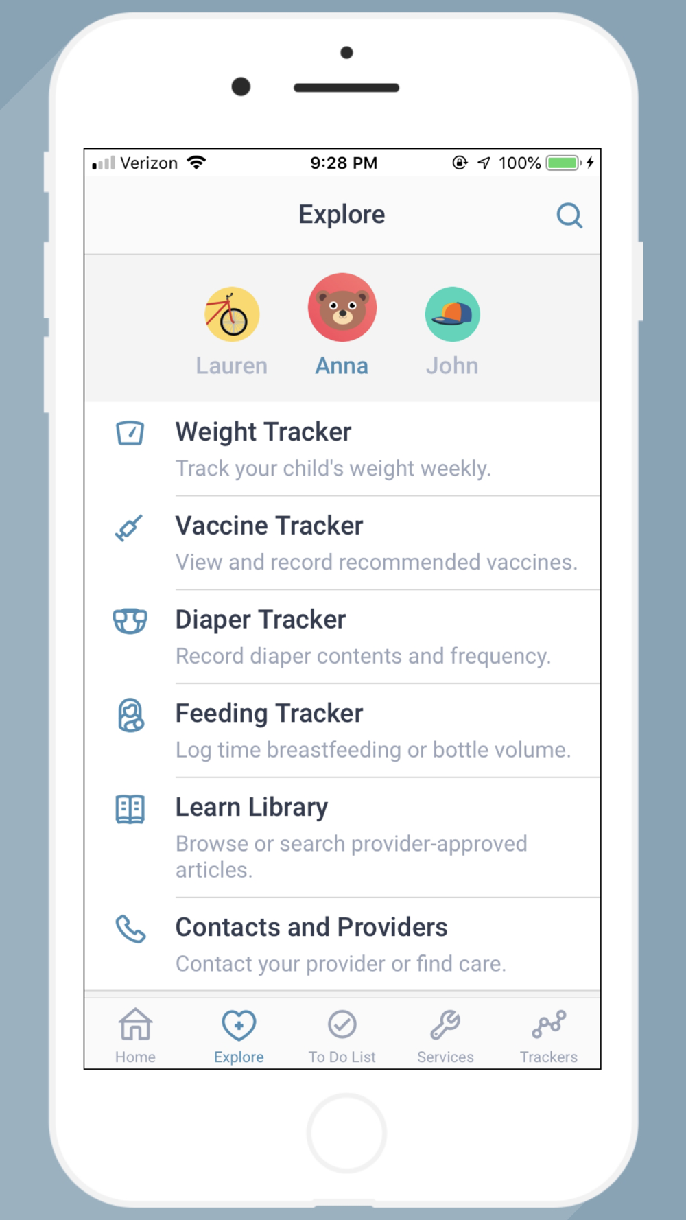 • Health-tracking tools for growth, feeding, diaper changes and vaccines.