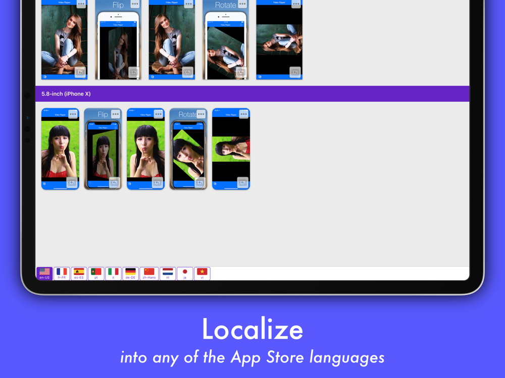 Pick the devices and languages, add background images, frames and titles, and drop in your screenshots. Export an xliff file for with the titles for translation, then import to add the text in your selected languages. Easy!