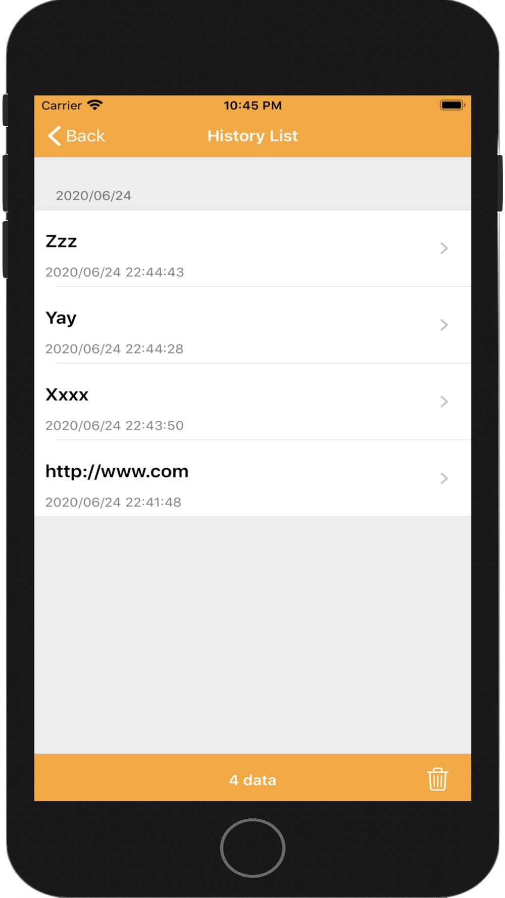 Also, since the scanned data of the QR code is displayed as a scan history by date on the history list screen, you can tap the scanned data and obtain the reading result again.