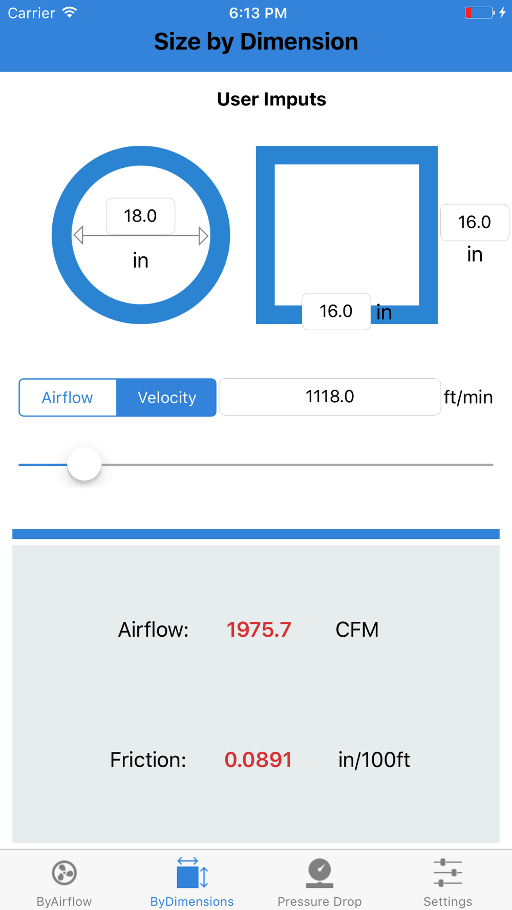 In the “Size By Airflow” tab you can input the airflow, friction or velocity and the aspect ratio. The app calculate the round (diameter) dimension and the equivalent rectangular diameter based on aspect ratio that you desire. It also calculate the velocity (if you input the friction) and the friction (if you input the velocity)