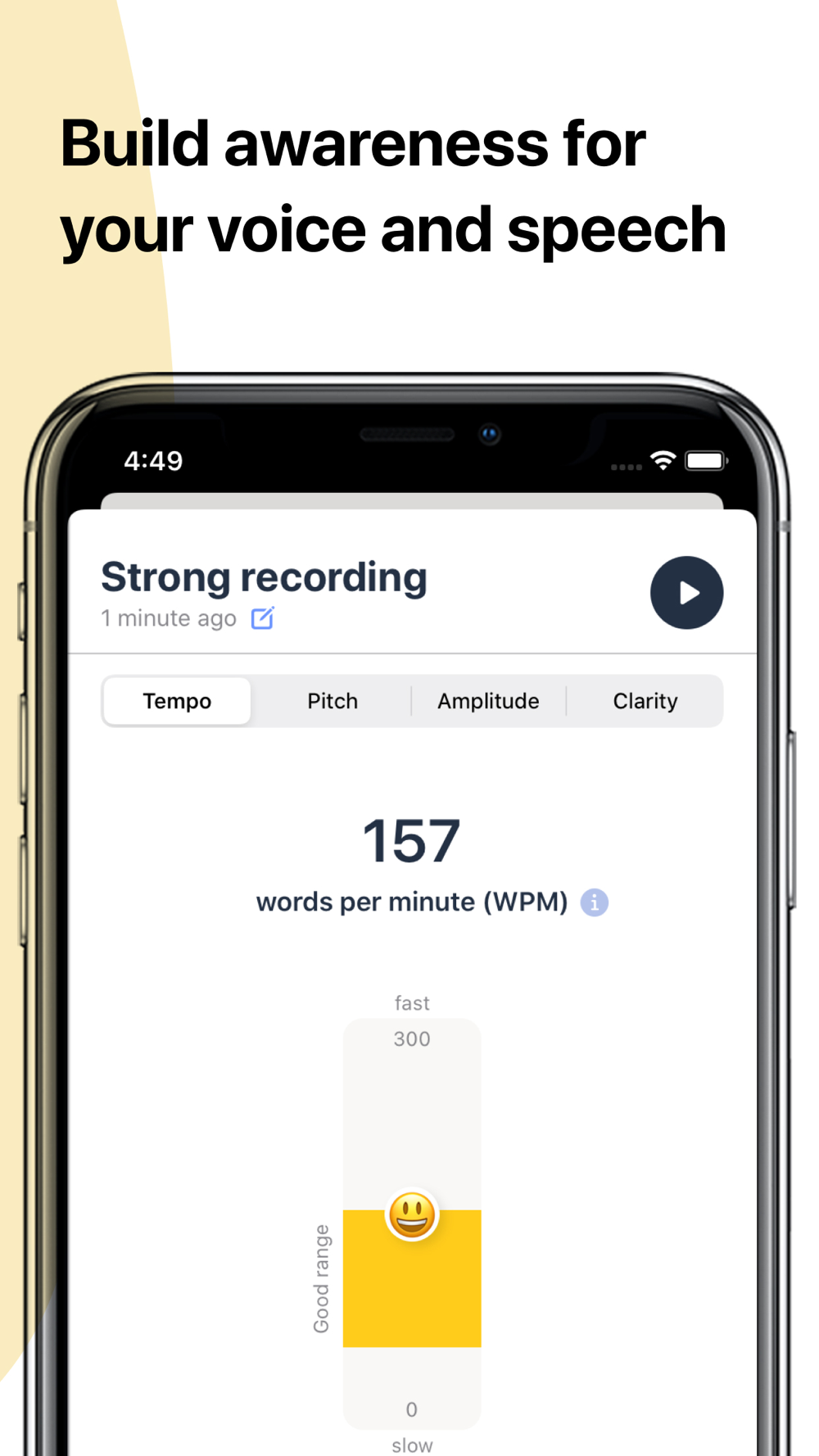 - Audio feedback and analytics on your speaking tempo, pitch modulation, and volume