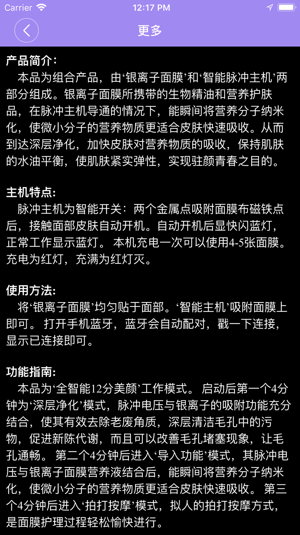 本品为组合产品,由‘银离子面膜’和‘智能脉冲主机’两部分组成。银离子面膜所携带的生物精油和营养护肤品,在脉冲主机导通的情况下,能瞬间将营养分子纳米化,使微小分子的营养物质更适合皮肤快速吸收。从而到达深层净化,加快皮肤对营养物质的吸收,保持肌肤的水油平衡,使肌肤紧实弹性,实现驻颜青春之目的。