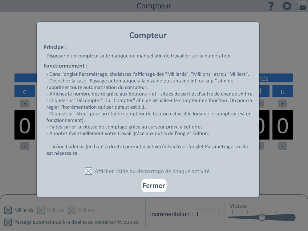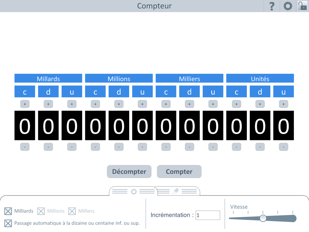 Cette application permet de disposer d'un compteur paramétrable (affichage ou non des milliards, millions et/ou milliers) afin de travailler sur la numération décimale.