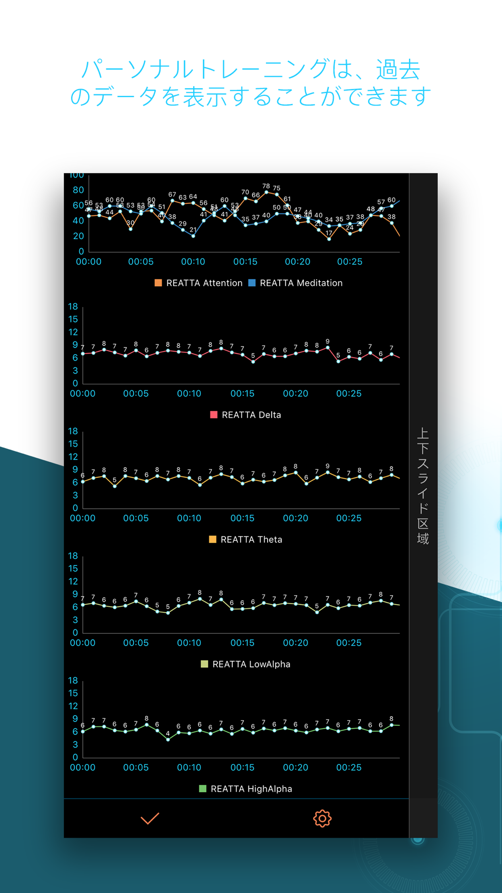 - 複数の脳波:8種類の脳波状態のモニタリングとデータ比較。