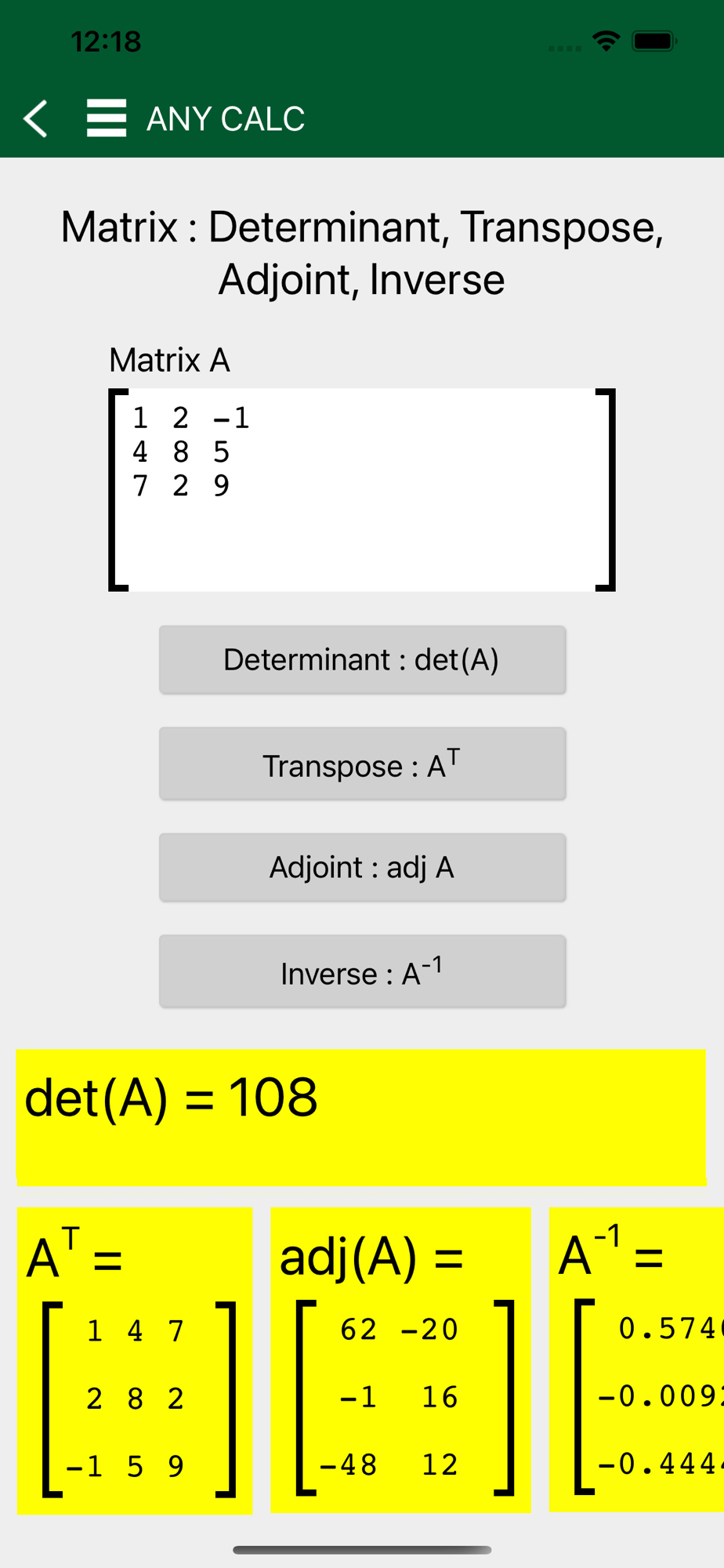 - Matrix : Determinant, Transpose, Adjoint, Inverse, Minor, Cofactor, Addition, Subtraction, Multiplication