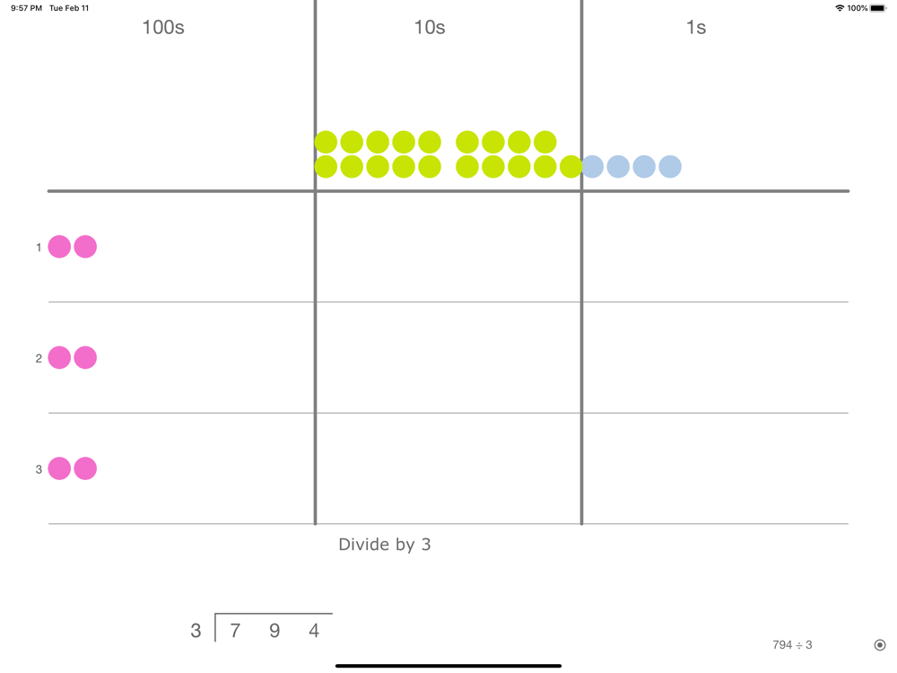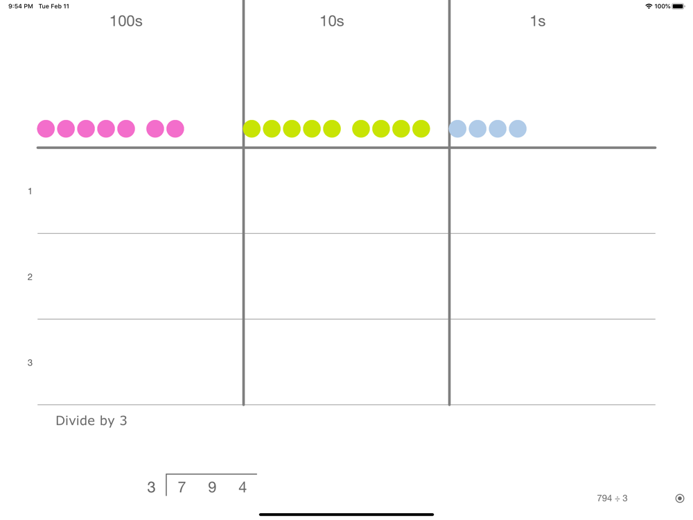 This math app is about visually dividing two numbers using place value discs.