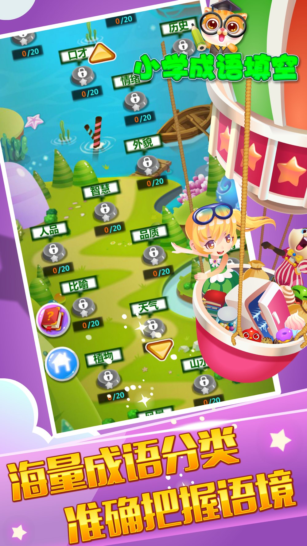 小学成语填空清爽简洁的画面,让您置身传统文化氛围,体验最有趣的文字游戏脑力挑战。让你在汉字王国的海洋里尽情享受中国博大精深文化的熏陶,在玩中学,更在学中玩!做一个真正的现代中华学霸。