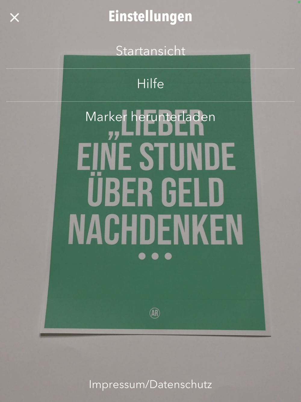 Dies ist eine Augmented Reality Anwendung bei der virtuelle Inhalte mit realen Markern verbunden sind.