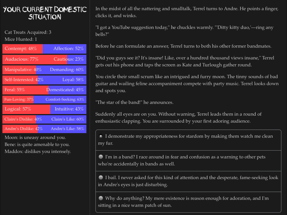 "Choice of the Cat" is a hilarious 600,000-word interactive novel by Jordan Reyne, where your choices control the story. It's entirely text-based, withoupet graphics or sound effects, and fueled by the vast, unstoppable power of your imagination.