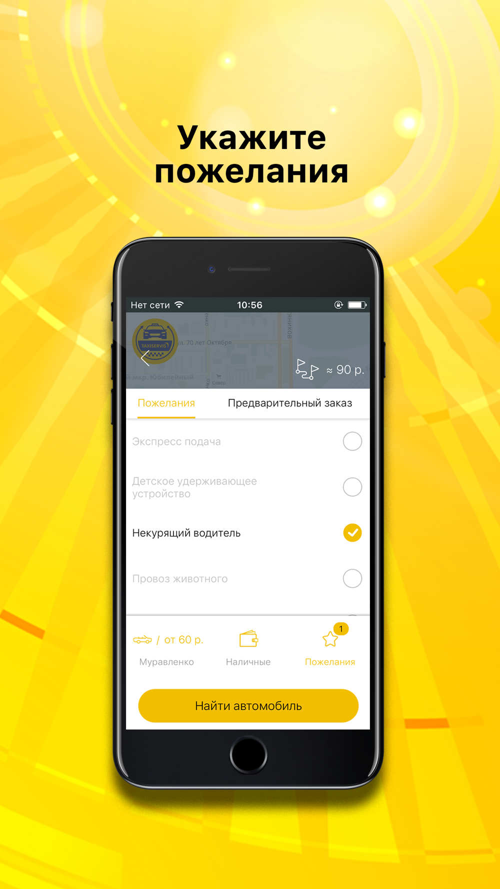 Быстрые поездки в такси онлайн благодаря автоматическому построению самого короткого маршрута до места назначения. Возможность оставить оценку работе водителя.