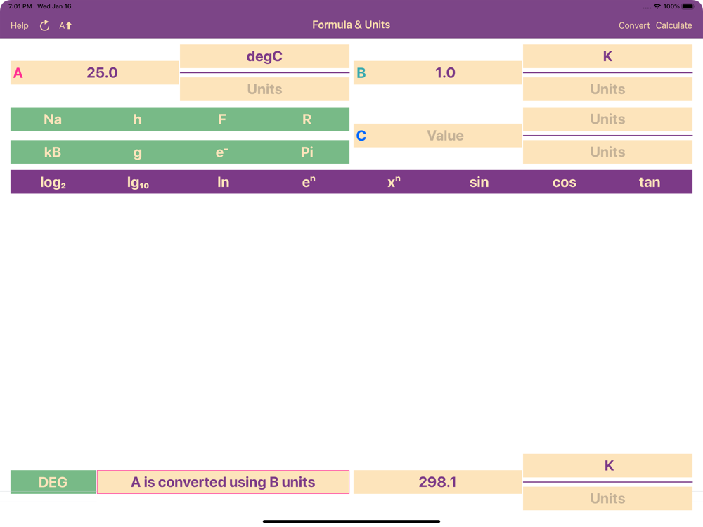 Formula & Units is an ultimate tool for calculation of complex scientific expressions and convertion of scientific units. Expressions may be comprised of variables and constants, possessing numeric values and sets of units.