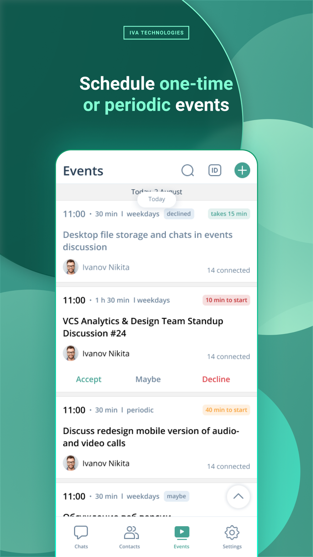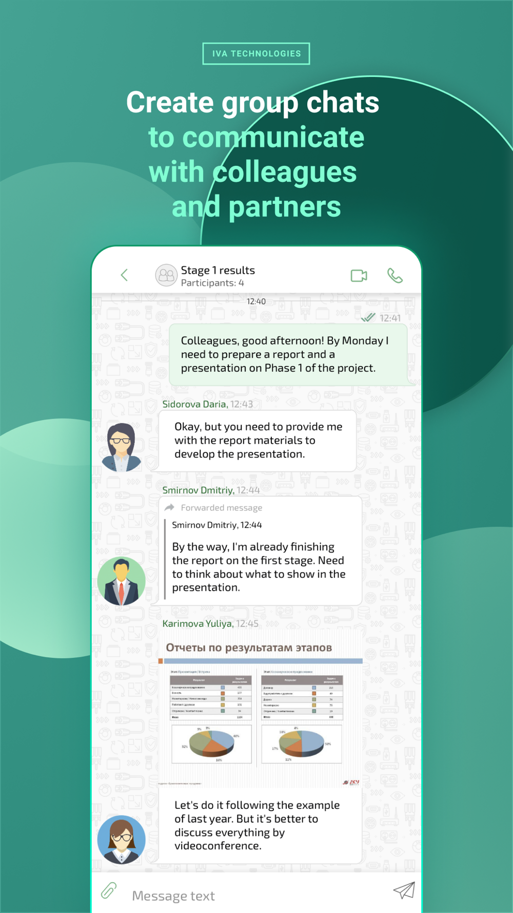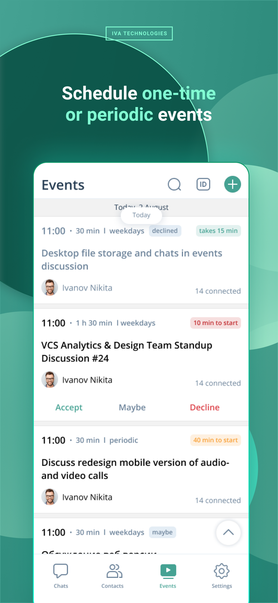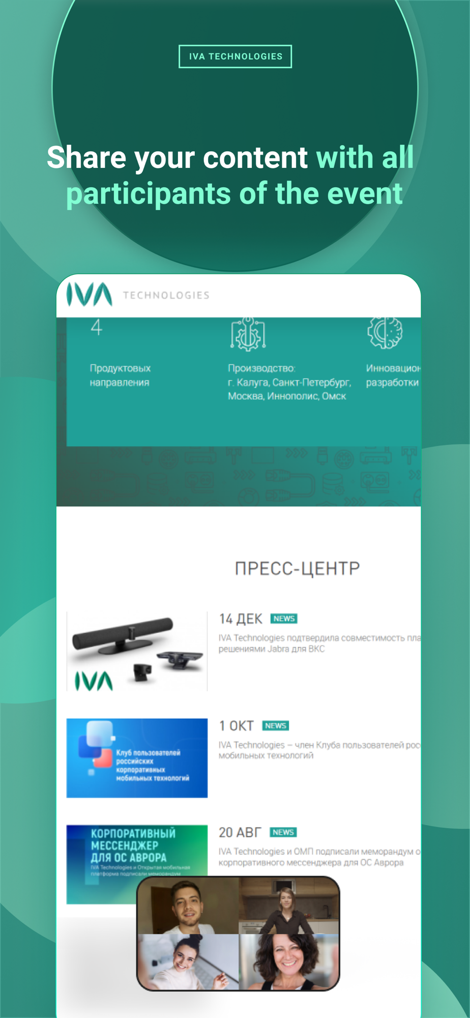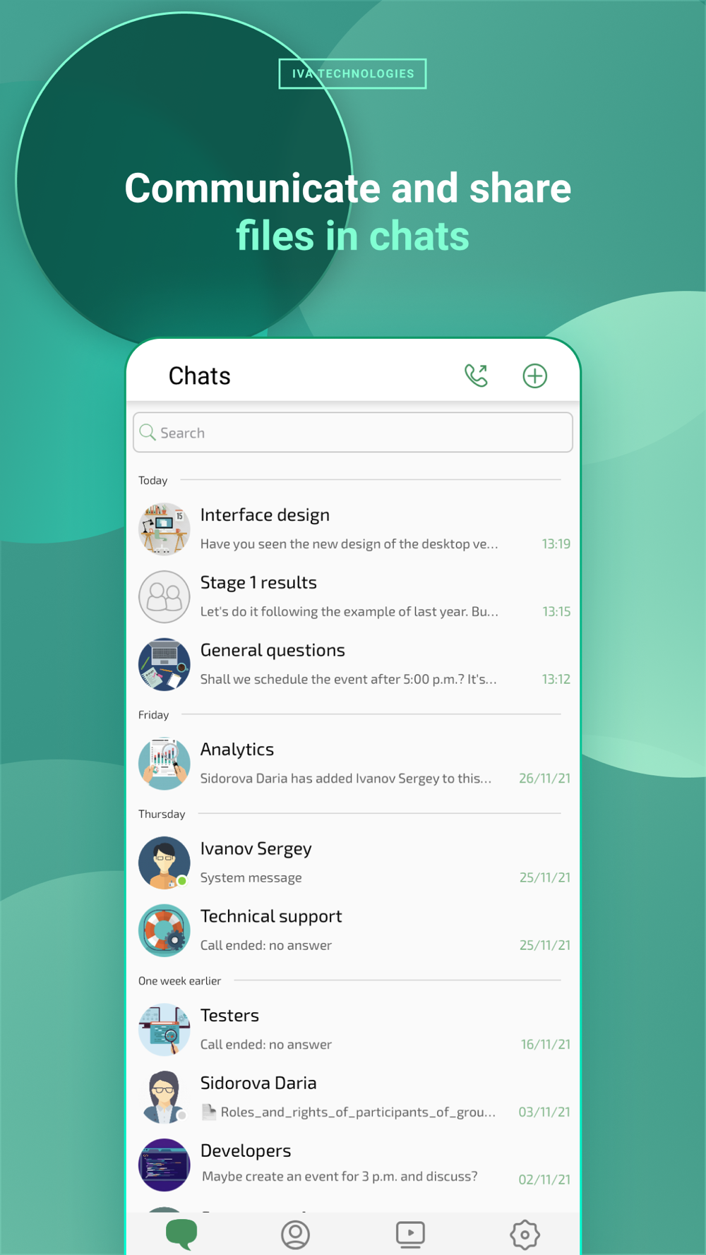 Stay in touch with your colleagues and partners 24/7, wherever you are! We created IVA Connect so you can work easily and conveniently from anywhere in the world. An intuitive user interface, secure communication channels, clear sound and high-quality video – these are just a few advantages of our messenger, which complements the IVA MCU video conferencing service.