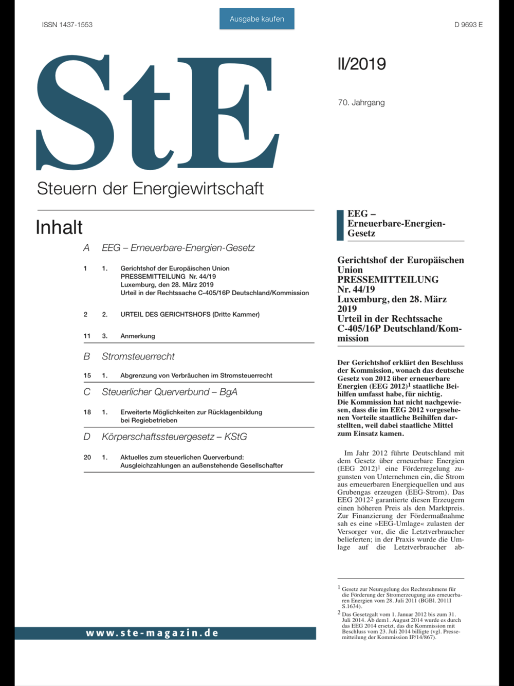 StE - Steuern der Energiewirtschaft informiert seit über 70 Jahren die Finanz-, Steuer- und Rechtsabteilungen in der Energiewirtschaft und Kanzleien über Gesetze, Verordnungen, Verwaltungsvorschriften und Rechtsprechung, die das Steuerrecht in der gesamten Versorgungswirtschaft betreffen.