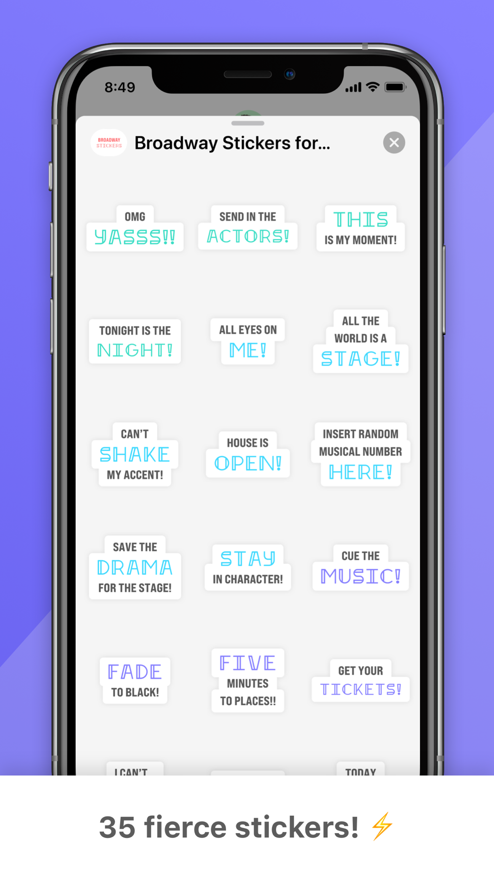 The PREMIER sticker pack for fans of the stage... make your messages FIERCE! These 35 sticker phrases are inspired by a passion for acting, theatre, dance, and the stage.