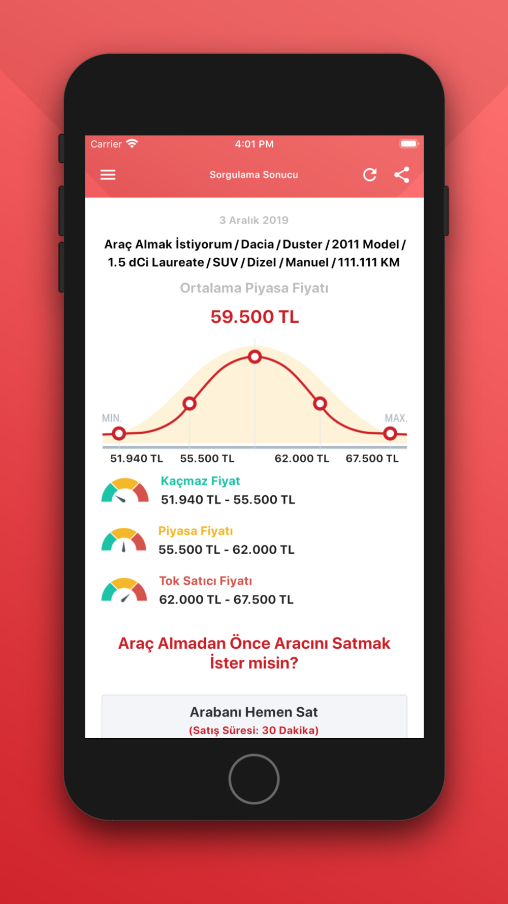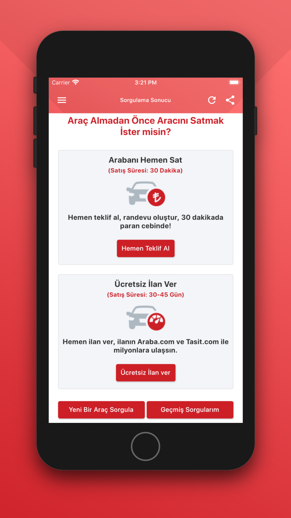Hesaplama sonucunda eğer aracınızı satmak istiyorsanız, Hemen Araba Sat ile teklif alabilir, ekspertiz randevusu sonucunda 30 dakikada aracınızı Araba.com’a satabilirsiniz. Veya önereceğimiz hızlı satar fiyatı üzerinden ilan da verebilirsiniz.