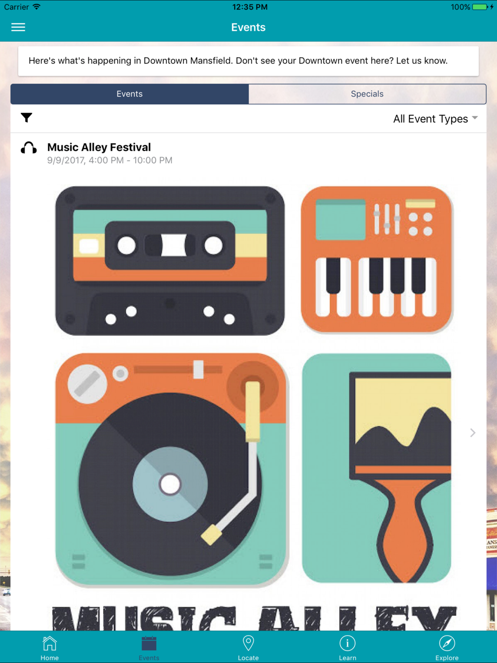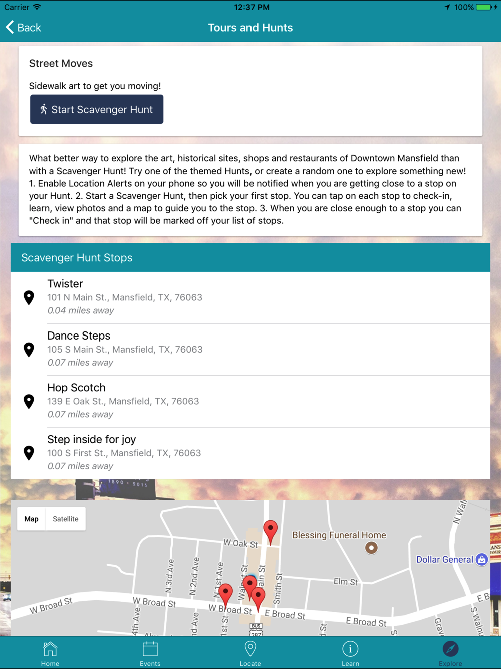 Use our app to Locate, Learn & Explore the vibrant mix of history, art, music, shopping, dining, film, theater, festivals and museums in the rapidly evolving historic district of Downtown Mansfield, Texas.