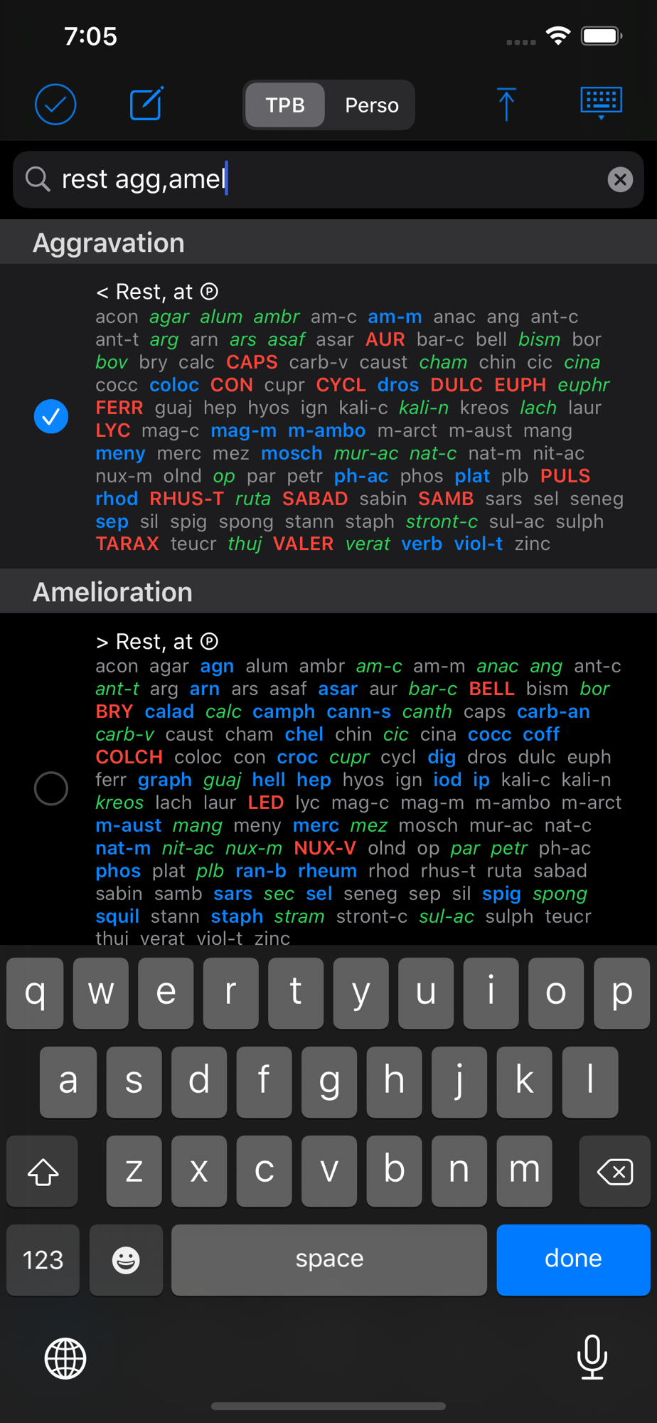 • The repertorisation does not discriminate between rubrics coming from the TPB or the Perso tables. All rubrics selected by users are listed in the Selection page where they can be managed indifferently (eliminatory rubrics, polar status, combination of rubrics, etc.) before displaying the result of the repertorisation in the Evaluation page. After combining (merging or crossing) several rubrics in the Selection page, the combined rubric can easily be copied and pasted into the Perso table.