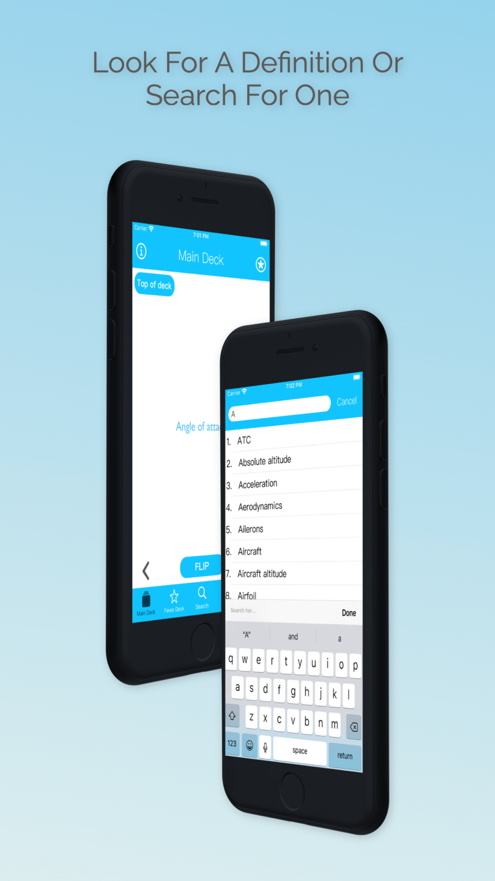 Aviation Basics makes it easy for you to understand and/or memorize the definitions provided by having a card. On the front of the card, there is a definition and the meaning of that definition is on the other side of the card. You can also see photos and videos for each and every definition, making it easier for you to understand the meaning behind the definition. Like a particular definition? There is a favorites deck where you can store your favorite definitions and meanings. In addition, you can search for a definition in the index and change the font size. Have fun and FLIP AWAY.