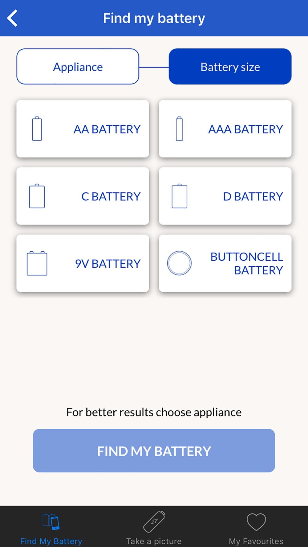 The app's battery finder functionality will provide you with all the information needed to choose the best battery for your appliance. You can save this battery for specific appliances around your home.