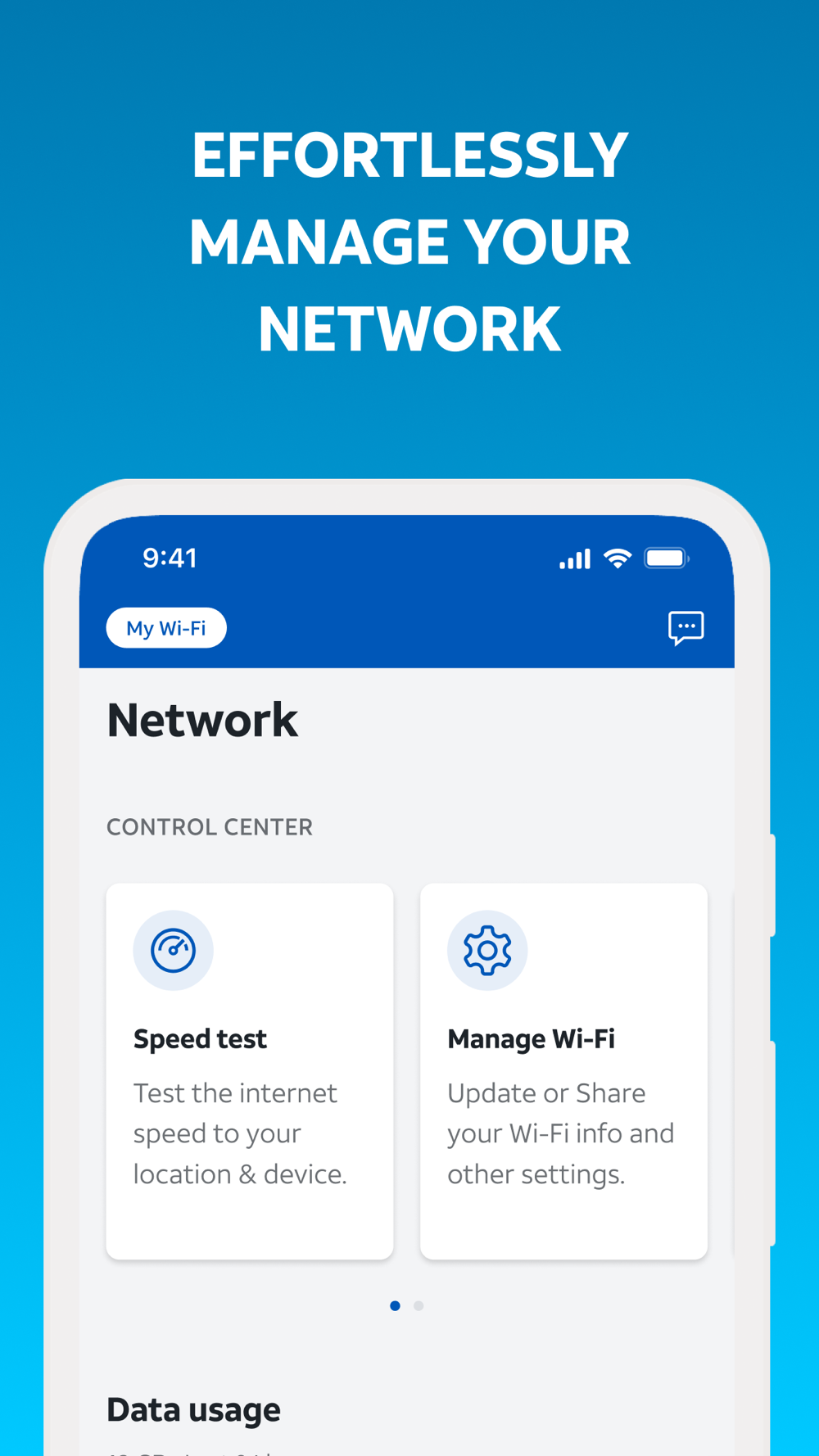 • Check your network health, get notified of issues and service outages, run speed tests, and more
