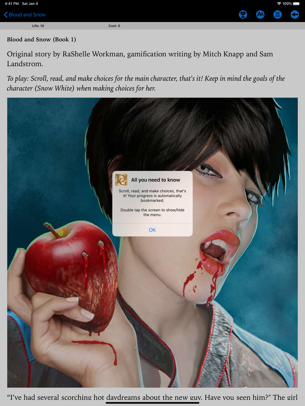 Delight Games has teamed up with author RaShelle Workman to create a game version of her hit full-length novel "Blood and Snow (Book 1)". As you read the story, you make choices for the main character (Snow White). Can you survive to the end? Can you get the high score for each part? Can you unlock the nearly 50 achievements including the "Daddy Issues" and "Crushing Move" achievement?