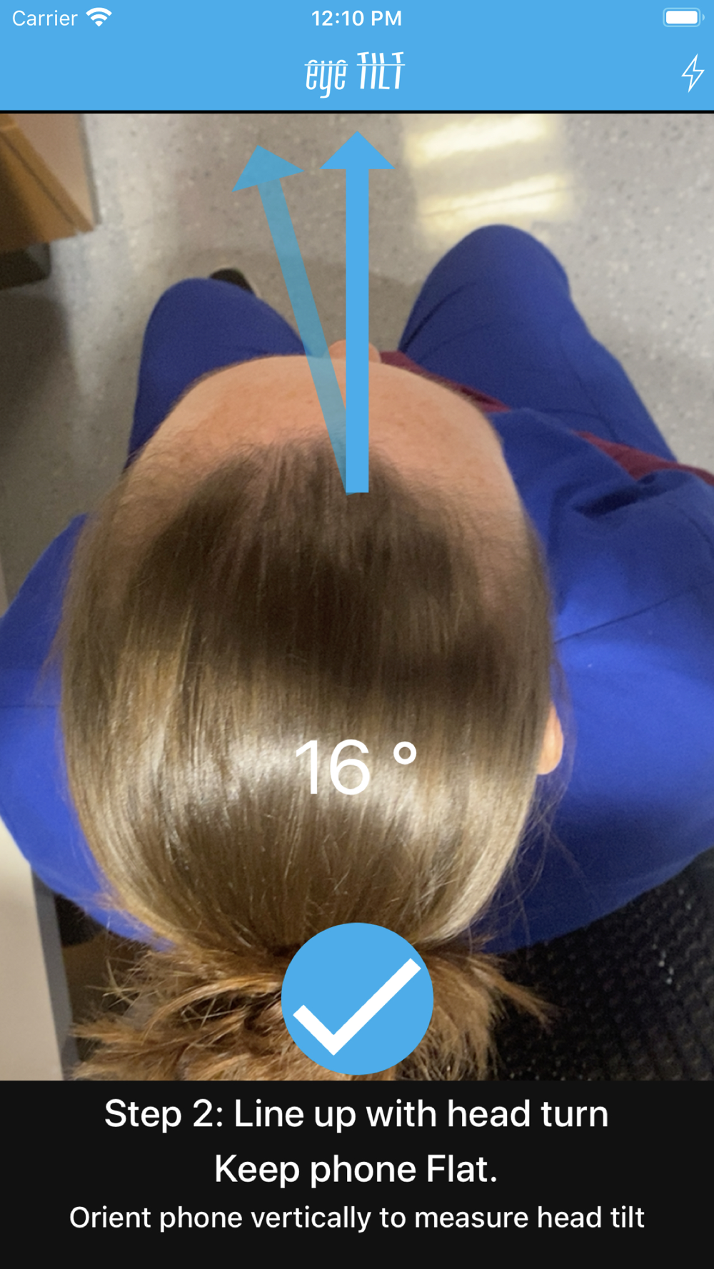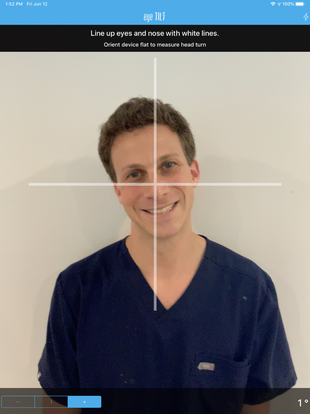 eyeTilt is an easy, quick, and efficient app to determine how many degrees someone's head is tilted or turned. Before eyeTilt, physicians could use a goniometer or "eyeball" to estimate the degree of head turn. Now, you can use your iPhone or iPad to measure head tilt and head turn.