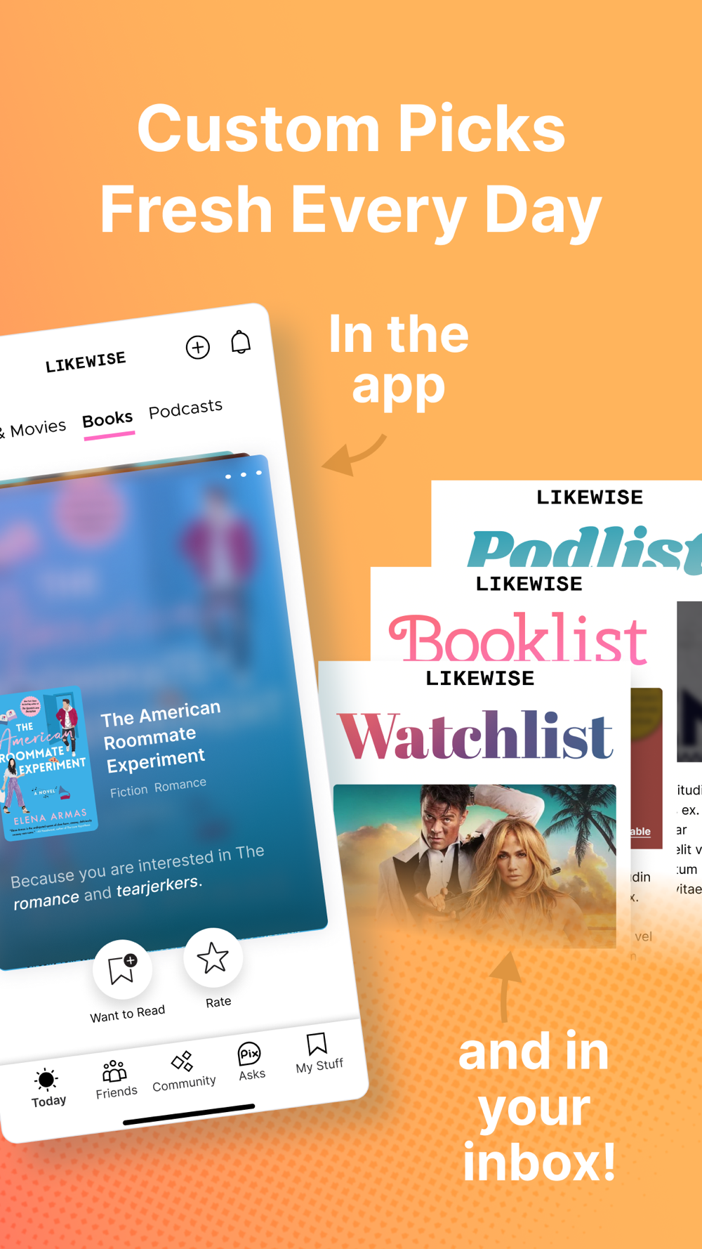 The Likewise app helps you quickly cut through the clutter by learning what you like. Along with help from Pix, your personal entertainment companion powered by AI, and real recommendations from real people, you can discover even more ways to find your next favorite book, show, movie, and podcast!