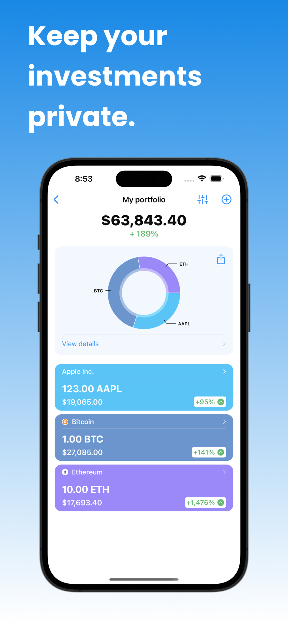 All the data entered in Bitfolio is stored on your device and in your private encrypted iCloud account only (if enabled).