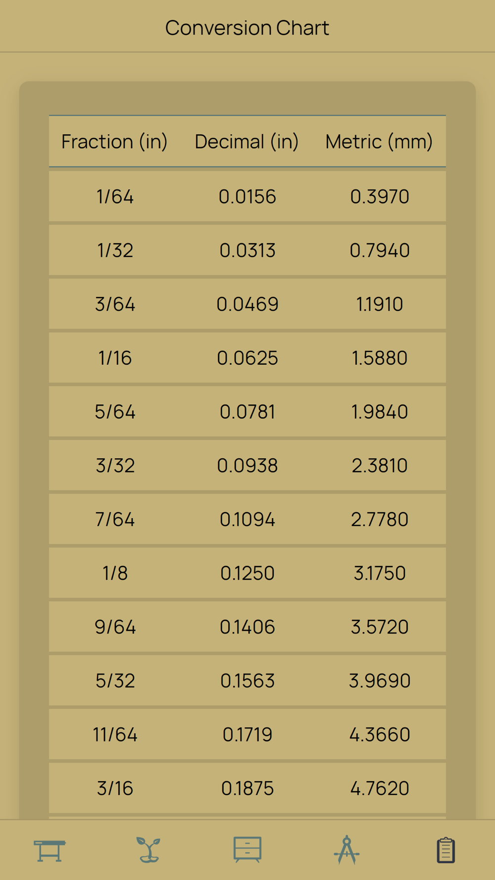* Fraction/decimal/metric conversion charts