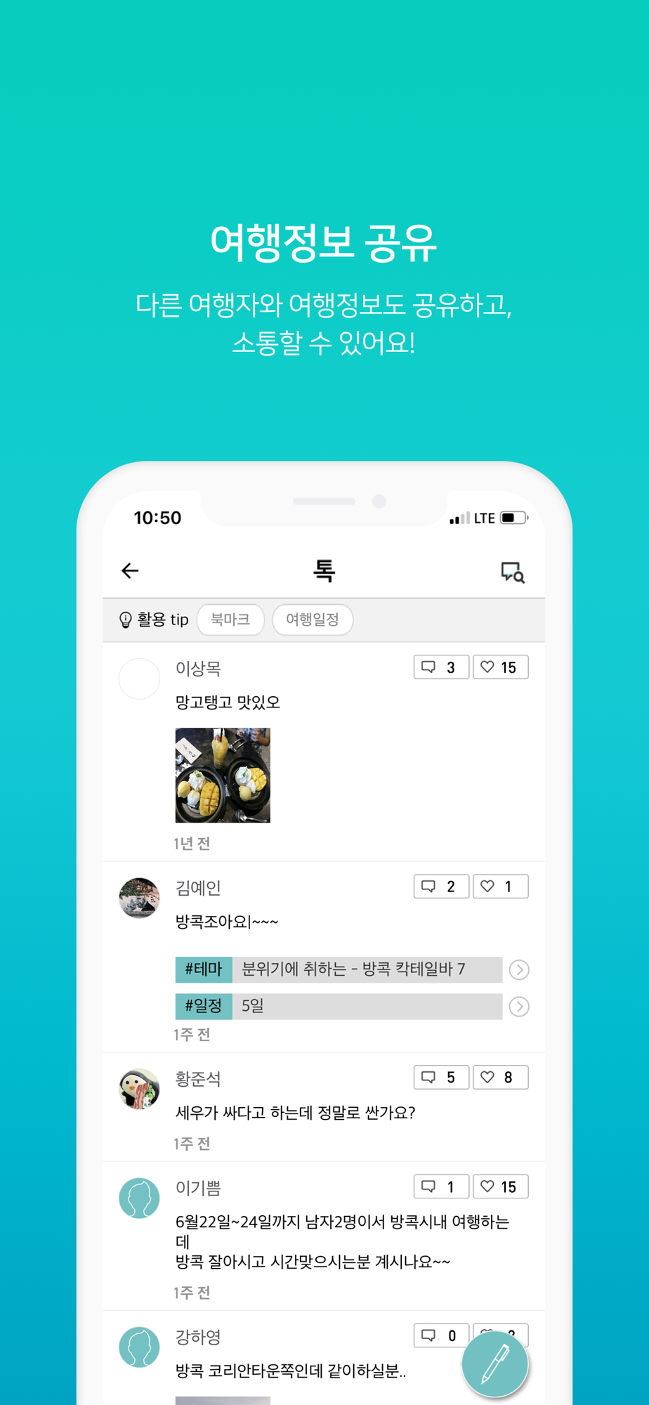 여행 중 갑자기 질문이 생겼을 때? 홀로 여행 중인데, 근처 여행 중인 사람을 찾고 싶을 때. 여행 중 나만보기 아까운 멋진 뷰를 사진으로 공유하고 싶을때! ‘톡’에서 여러 여행자와 함께 자유롭게 소통할 수 있어요. 방콕 여행정보 실시간 공유!