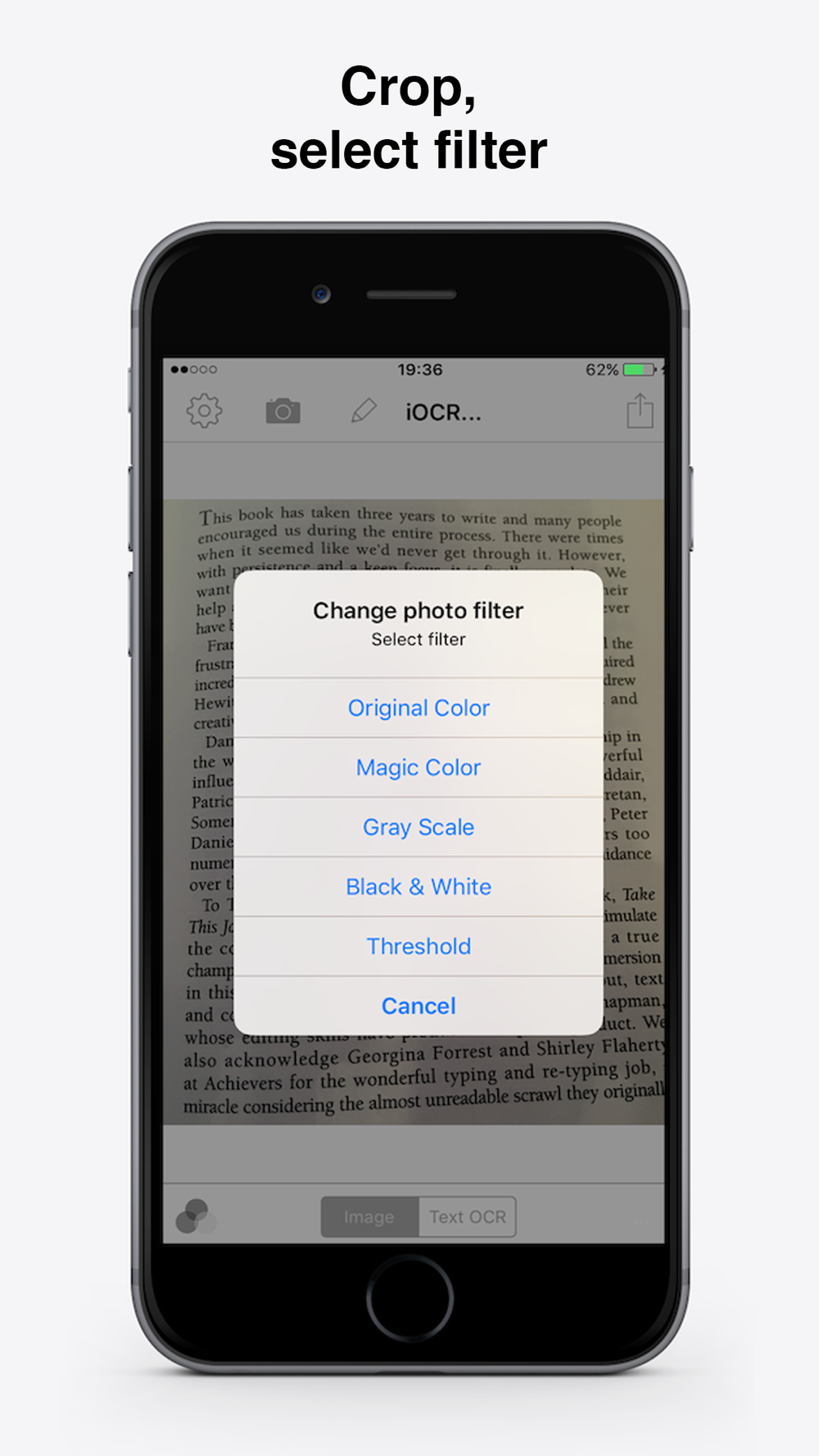 Get text from any document just tap the "Text OCR" button. You can send scanned documents via email, export to Photos or open in any 3rd party application.