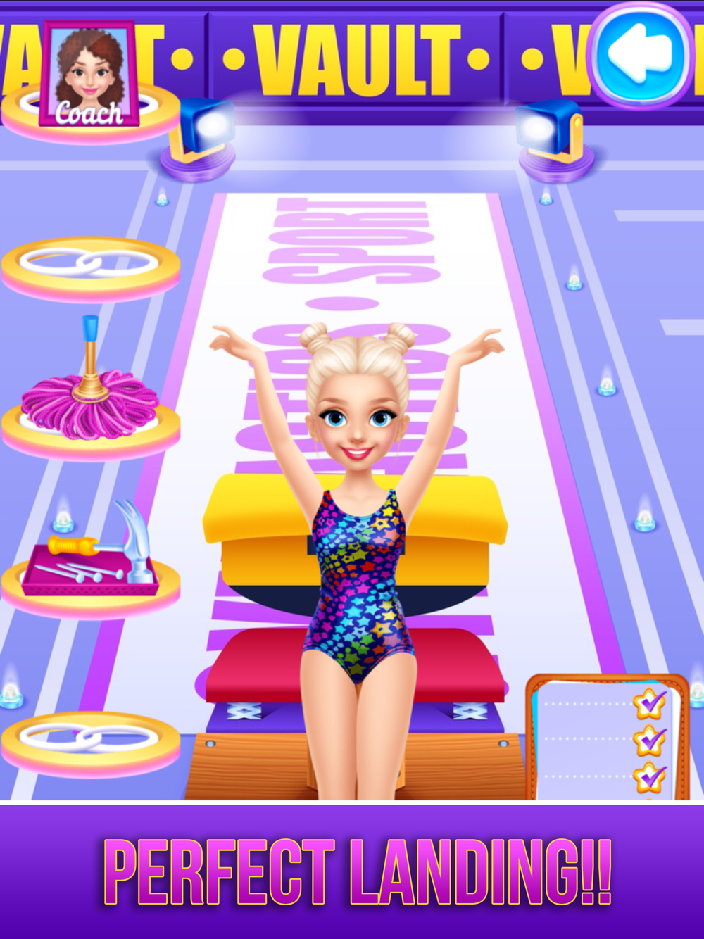 Level 4 : Do the uneven bars. Listen to music, place the coach, add powder to bars, fix the broken bars and more!