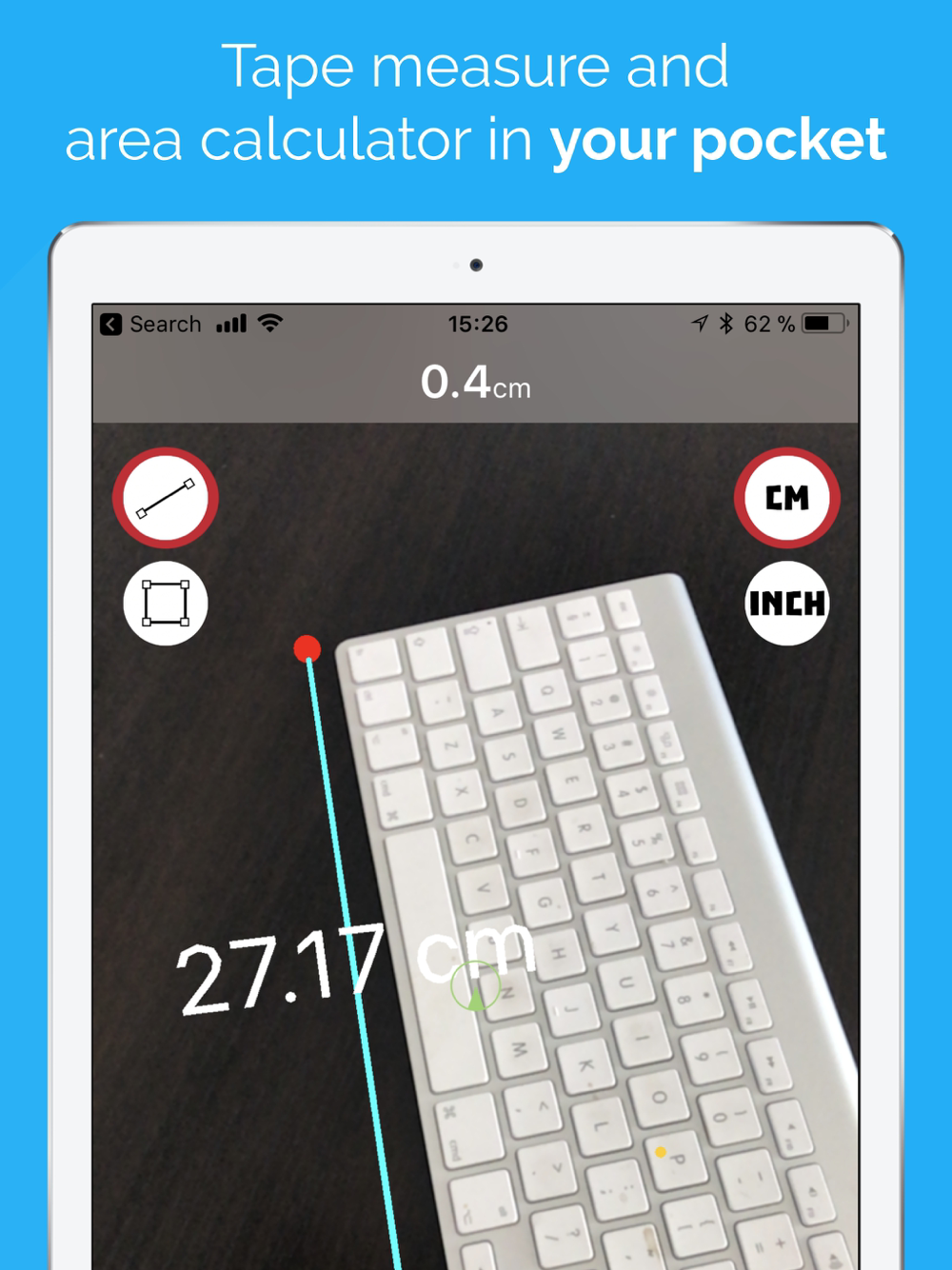 Measure any distance or area in Augmented Reality. Drag a line between 2 points to find the distance, or make any shape and find it's area.