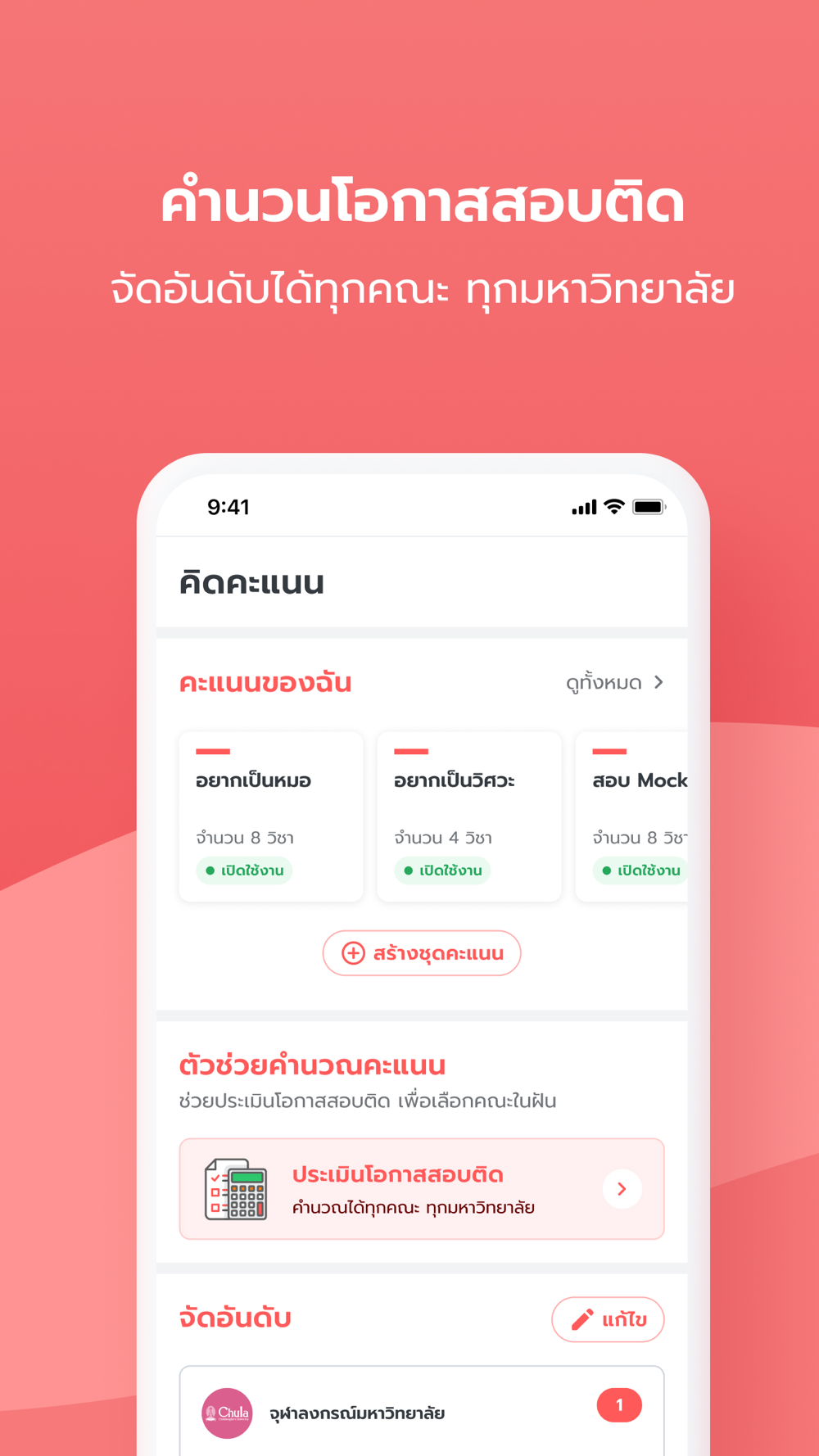 ช่วยประเมินโอกาสสอบติด อิงจากคะแนนสอบเทียบกับระเบียบการจริงในคณะที่สนใจ ฝึกประเมินการจัดอันดับเพื่อเตรียมพร้อมก่อนยื่นคะแนนจริง
