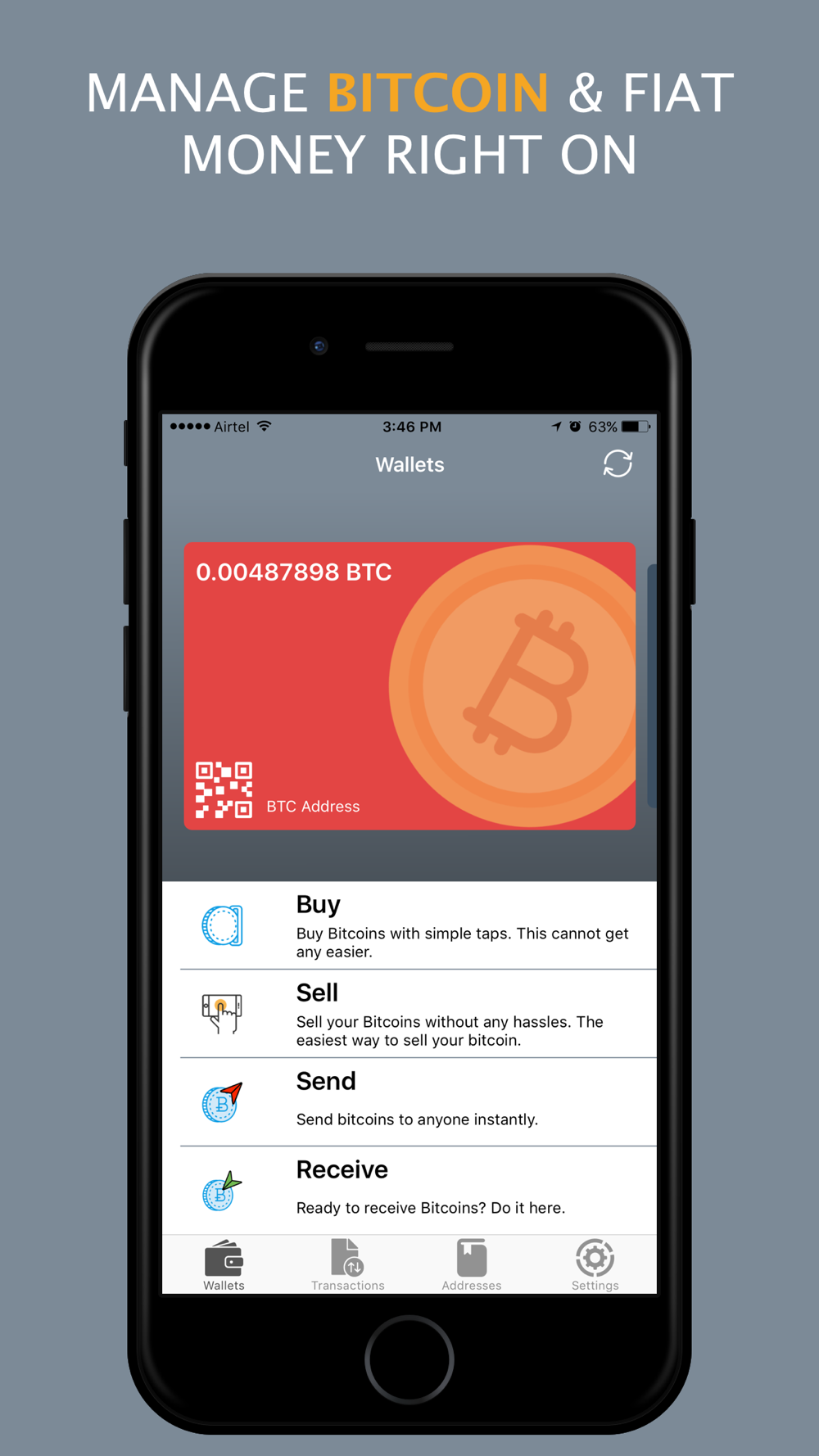 - Send, receive, buy and sell crypto-currency on-the-go.