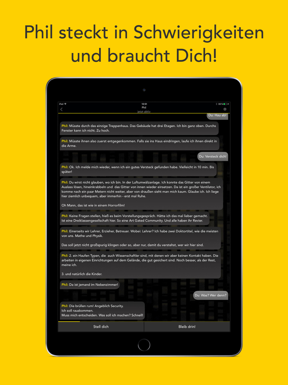 Erlebe ein kniffliges Abenteuer im Messenger-Style! Du bestimmst mit deinen Entscheidungen den Verlauf der Geschichte und hilfst Phil zu entkommen. Teste ob du mit deiner Kommunikation das Rätsel lösen kannst - in Echtzeit! Spring in der Geschichte zurück, wenn du einen Ausgang erreicht hast und entdecke die alternativen Enden. Ein langer Spielspaß ist garantiert!
