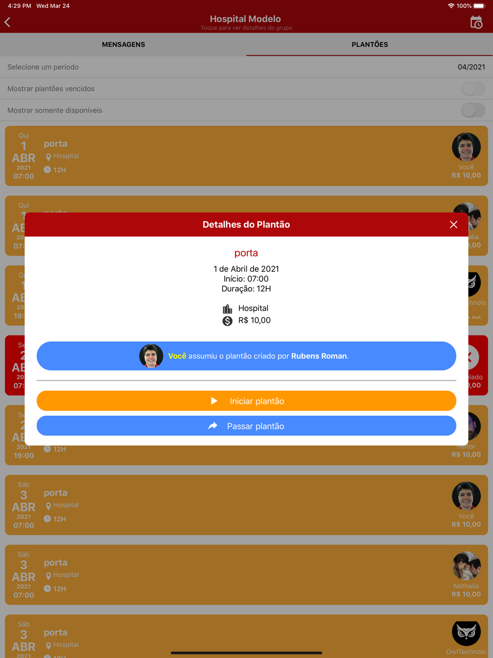 O app permite tornar colegas admin, excluir do grupo, trocar mensagens particulares e até bloquear algum usúario de pegar plantões (no caso de colegas sem documentação completa ou outro motivo qualquer).