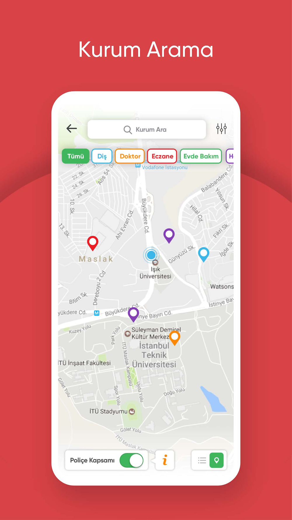 lokasyonunuza göre filtreleyebilir, harita üzerinden iletişim ve yön bilgilerine