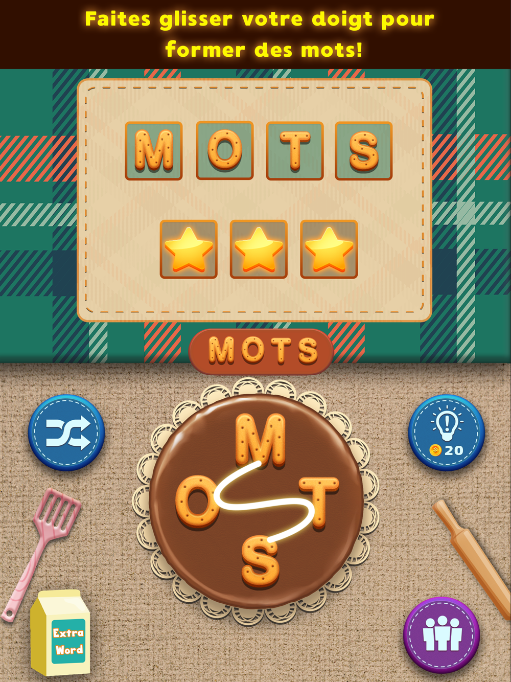 Les règles du jeu sont simples : Faites glisser les blocs de lettres pour former des mots et gagner des écus ! TÉLÉCHARGEZ « Mots Cookies » sans attendre pour commencer à réveiller votre cerveau et devenir un crack du vocabulaire !