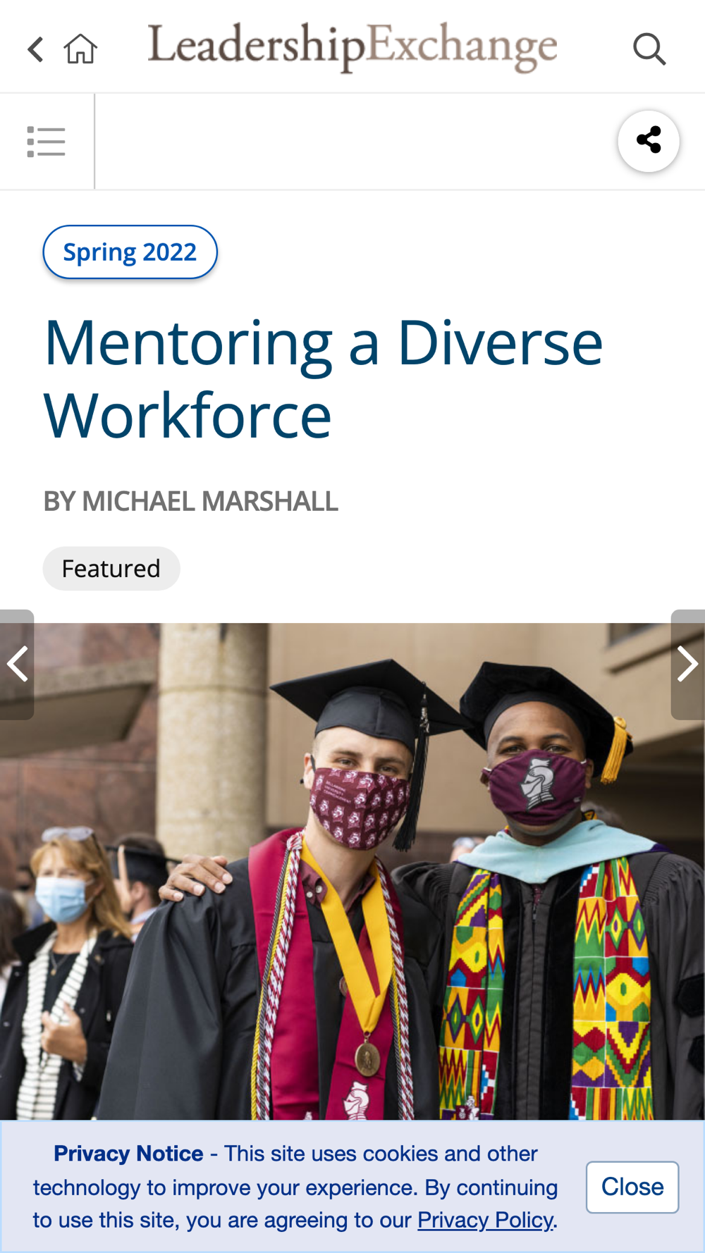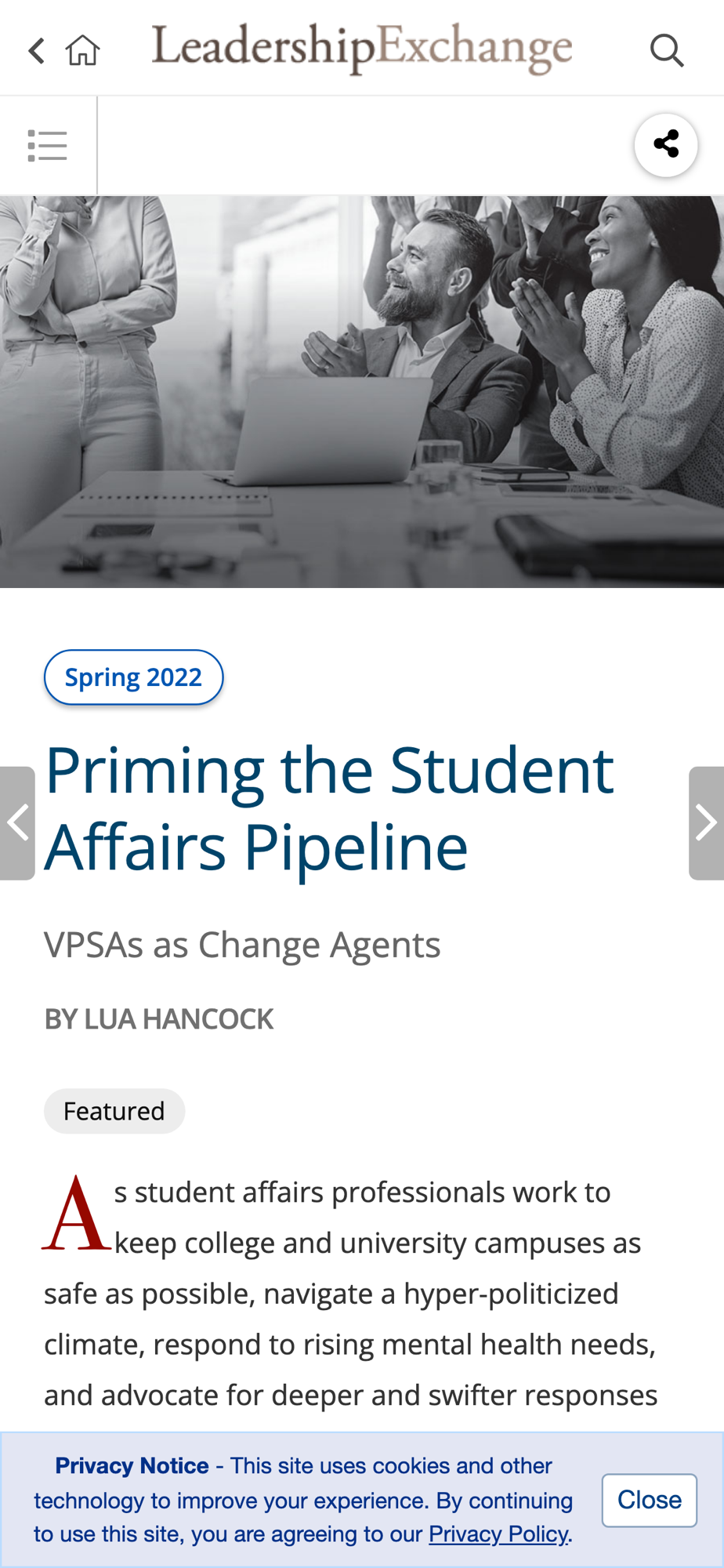 Leadership Exchange prepares vice presidents for student affairs for today's most complex higher education management challenges. The magazine delivers expert analysis on the latest trends in student affairs, perspectives from leaders in higher education and management, and tips and tools for managing diverse staffs and an ever-expanding set of responsibilities. NASPA members have full access to the Leadership Exchange archives.
